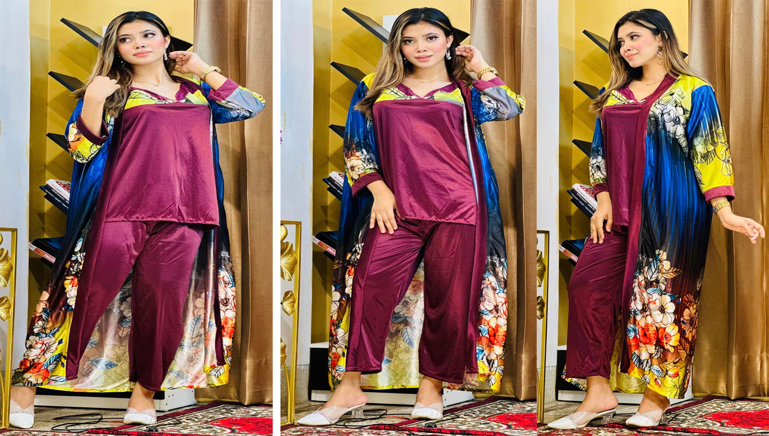উমাইশা ফ্যাশান নিয়ে এসেছে মেয়েদের জন্য সফট ও স্টাইলিশ সিল্ক কাপড়ের 3 পার্ট নাইট সেট।🌙 নরম আরামদায়ক সিল্ক নাইটসেট 🌙