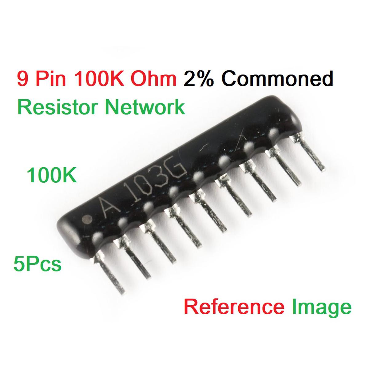 100K Ohm 8 Commoned Resistor Network Array 9 PIN.This Singe In-Line component is actually 8 individual 10K Ohm resistors that share a common terminal on pin 6 (denoted with a black dot).