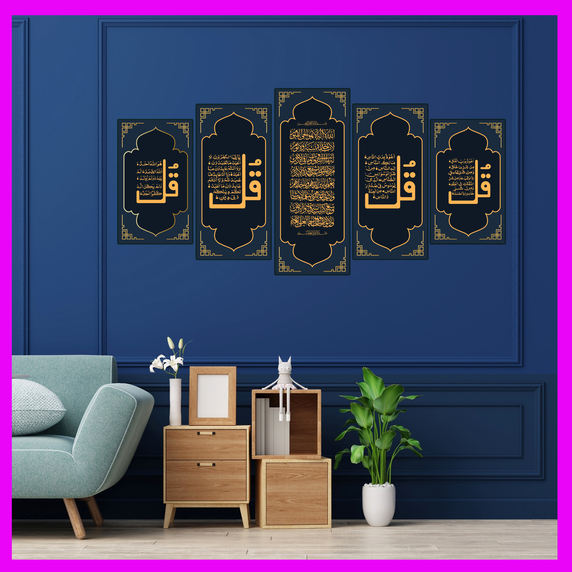Five Kul Ayatul Kursi Surah Nas Falak Ikhlas Kafirun Printing Canvas for wall decoration at Bed Room or Drawing Room (Five pieces in One Set).