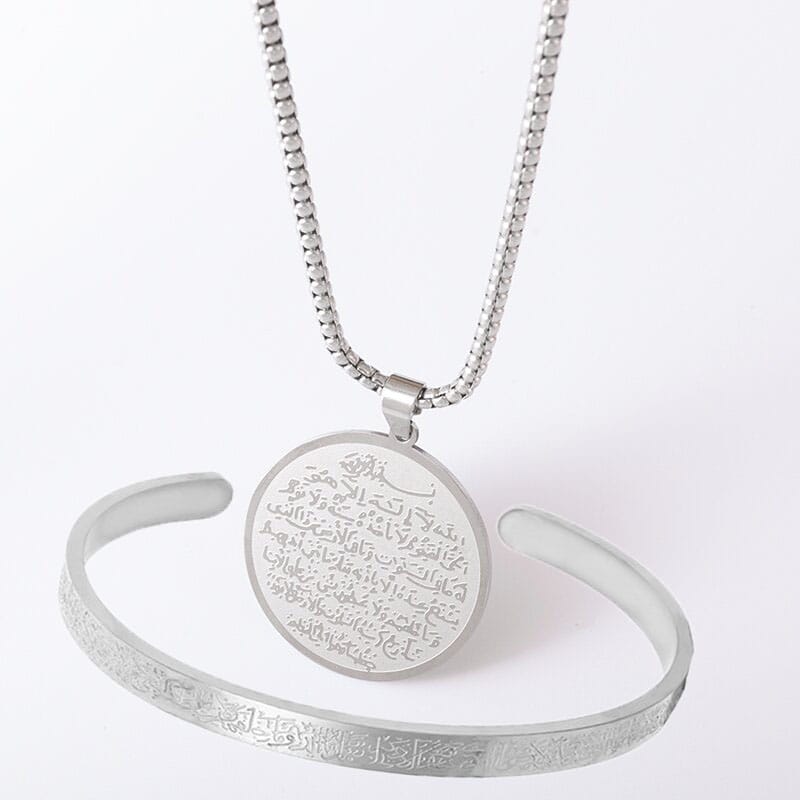 Arabic Calligraphy Ayatul Kursi Necklace for Men Women Stainless Steel Quran Amulet Islam Eid Ramadan Gifts 2 Pcs Set