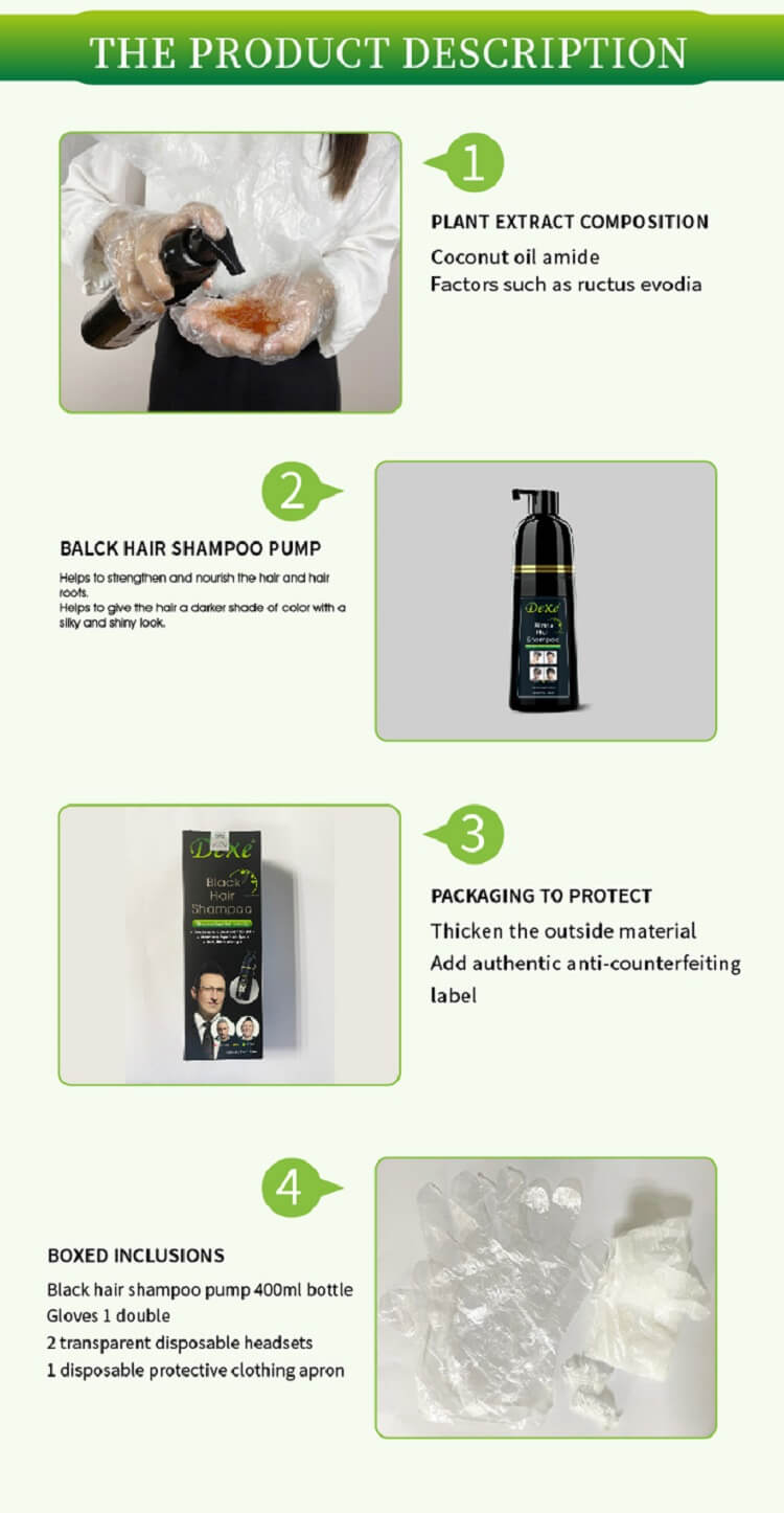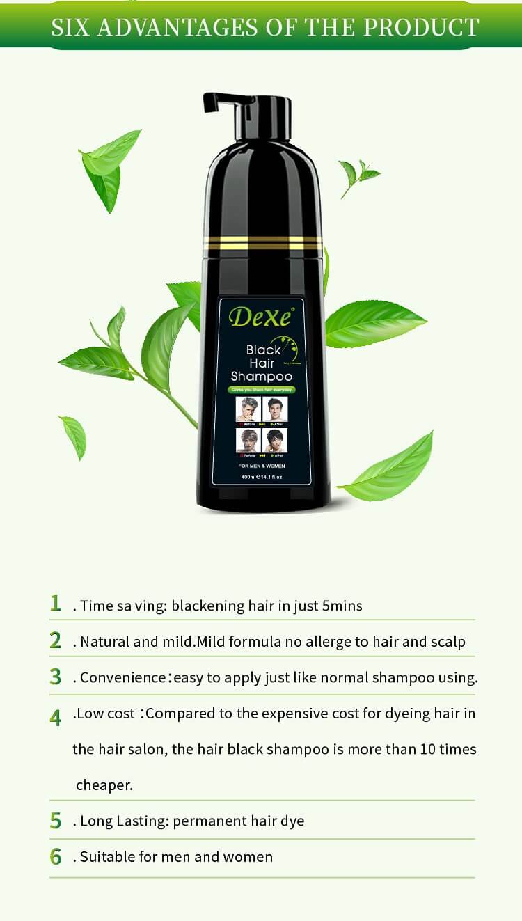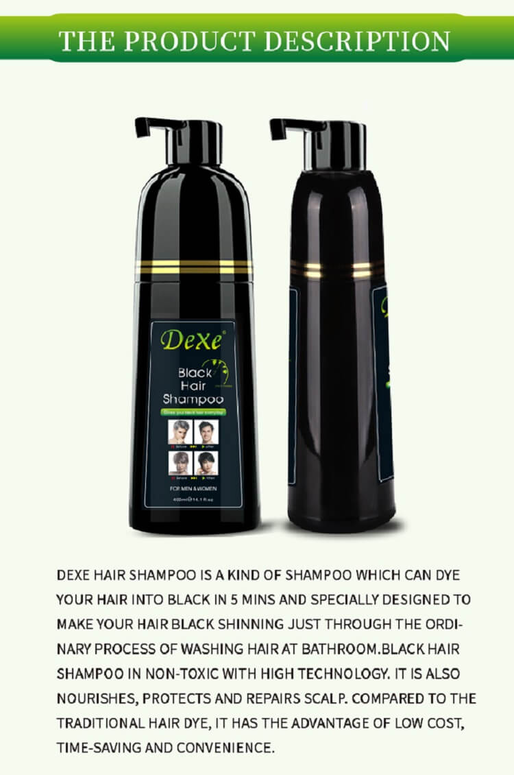 Dexe Black Hair Shampoo is a kind of shampoo which can dye your hair into black in 5 mins and specially designed to make your hair black shinning just through the ordinary process of washing hair at bathroom.Black Hair Shampoo in non-toxic with high technology. It is also nourishes, protects and repairs scalp. Compared to the traditional hair dye, it has the advantage of low cost, time-saving convenience.