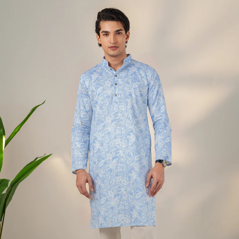 The Azure Panjabi captures the essence of cool sophistication with its deep blue tone and intricate leafy motifs. Lightweight and airy, it’s designed for those who appreciate style and comfort. Whether it’s a casual day out or a festive gathering, this piece fits effortlessly into your wardrobe.
