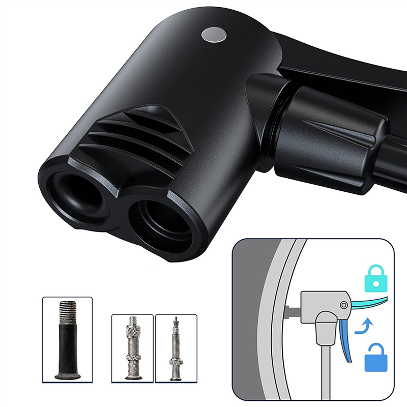 Dual head universal pump for all valve types: Presta Valves, American Valves, Auto/Auto Valves, Motorcycle Valves, Valves.