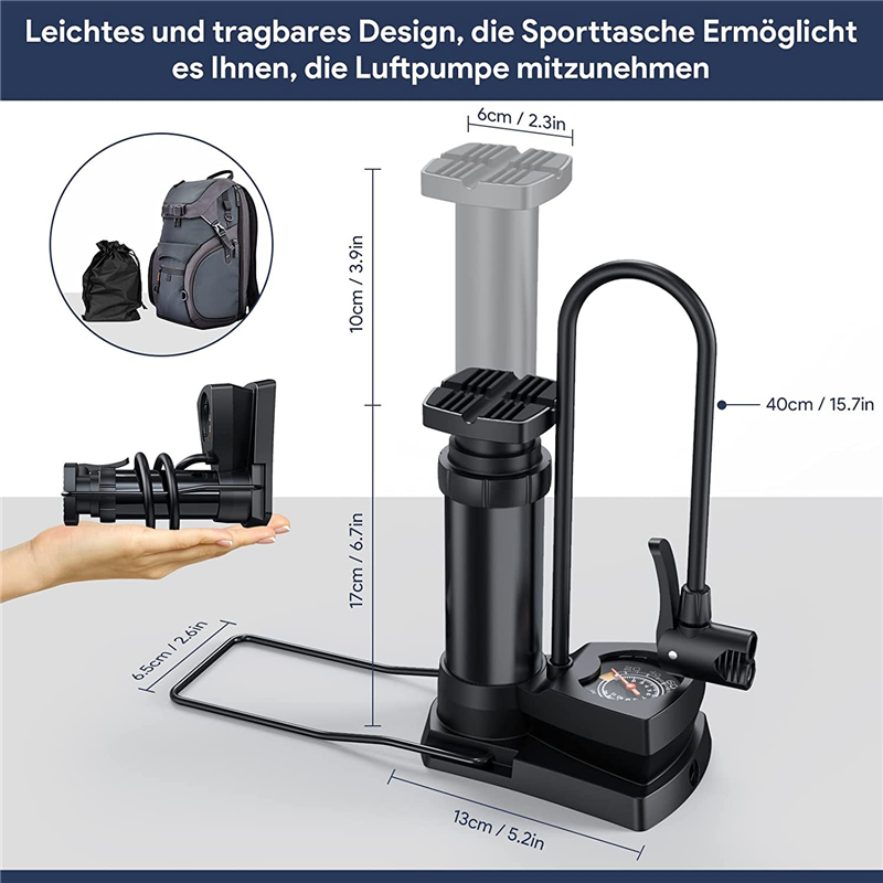 Thanks to the non-slip rubber pedals, the pump is more stable during use. Our tire pump weighs only 390 grams and is 17 cm high. With a gym bag, you can take the pump with you .