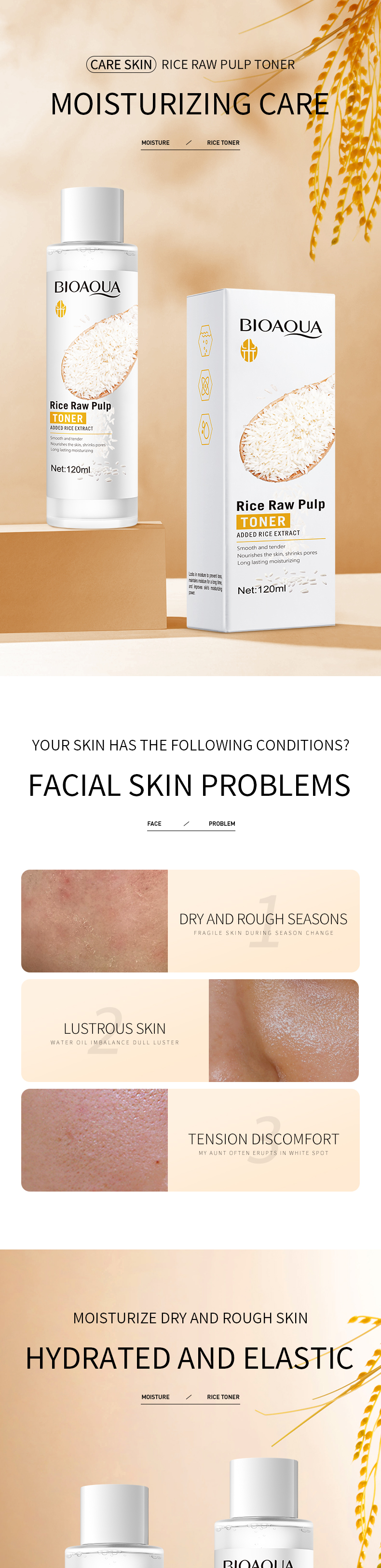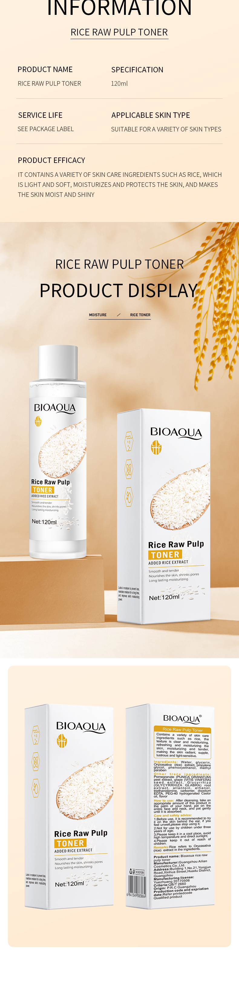 BIOAQUA Smooth Skin Moisturizing Rice Raw Pulp Face Toner - 120mL