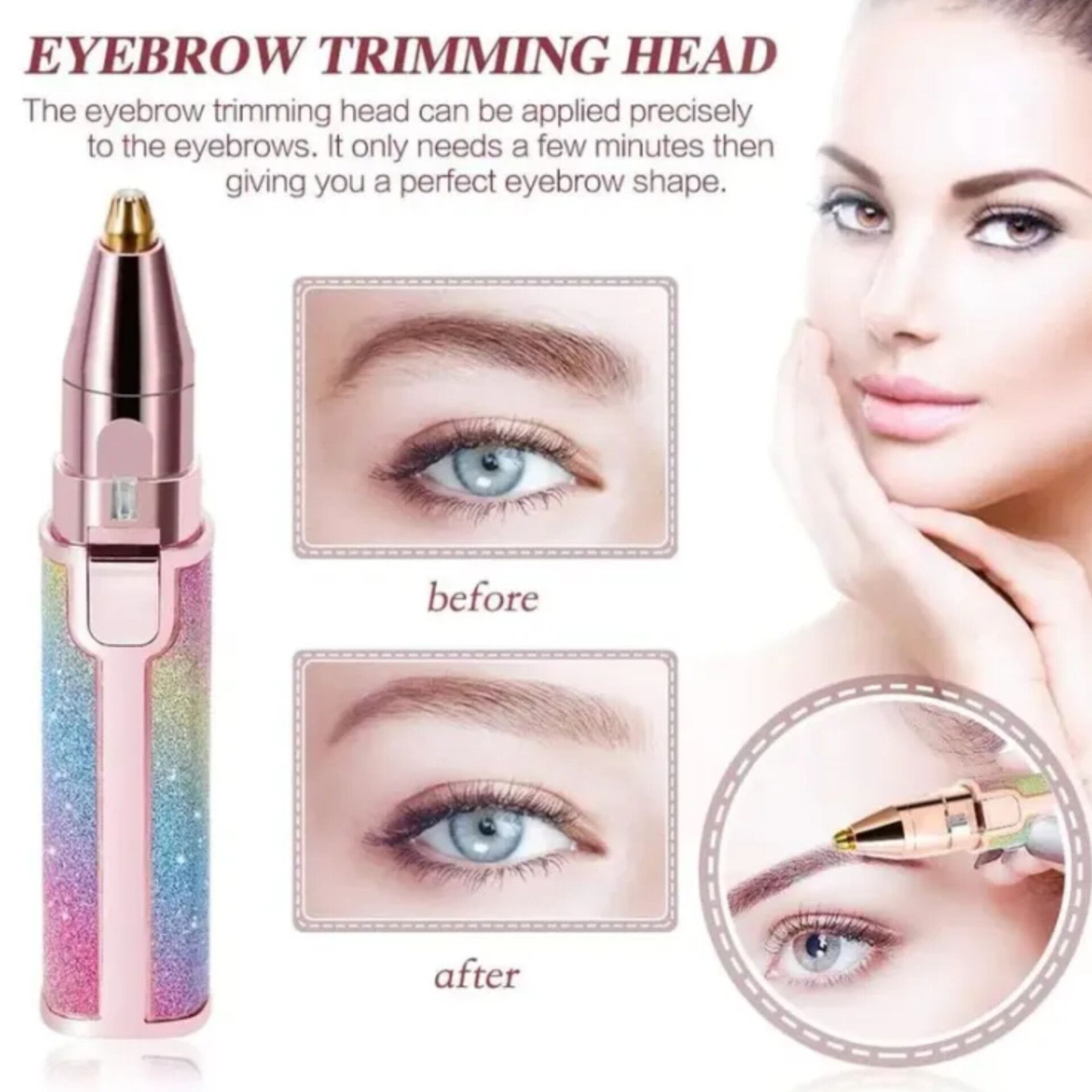 Compact Design: The trimmer has a sleek and compact design, making it portable and easy to carry in your purse or travel bag for grooming on-the-go. Dual-Functionality: This trimmer serves a dual purpose by allowing you to trim both your eyebrows and upper lip hair efficiently. Precise Trimming: Equipped with high-quality, fine-tipped blades, the trimmer ensures precise trimming without causing any cuts or irritation to the delicate skin around the eyebrows and upper lip. Gentle on Skin: The trimmer is designed to be gentle on the skin, making it suitable for individuals with sensitive skin types. Easy to Use: It features a simple and user-friendly operation, allowing you to achieve professional-looking results without any hassle. Battery-Powered: The trimmer is battery-powered, eliminating the need for cords or charging cables, providing you with convenient usage anytime, anywhere. Easy Maintenance: The trimmer is easy to clean and maintain, ensuring hygiene and longevity of the device. Versatile: Apart from eyebrows and upper lip hair, it can also be used for precise grooming of facial hair in other areas such as the chin or cheeks.