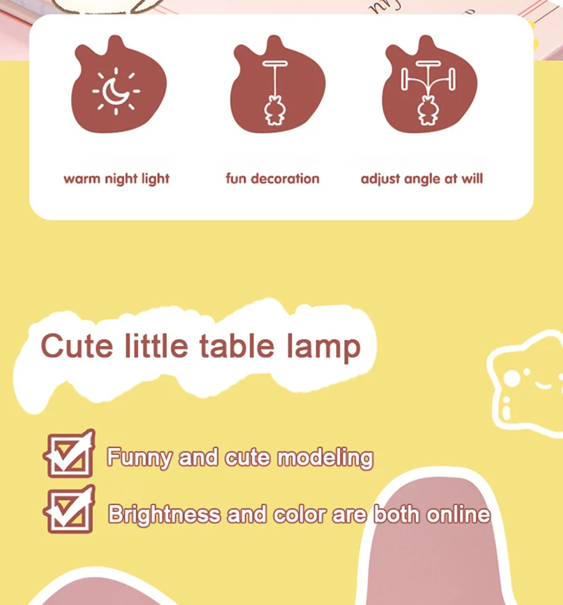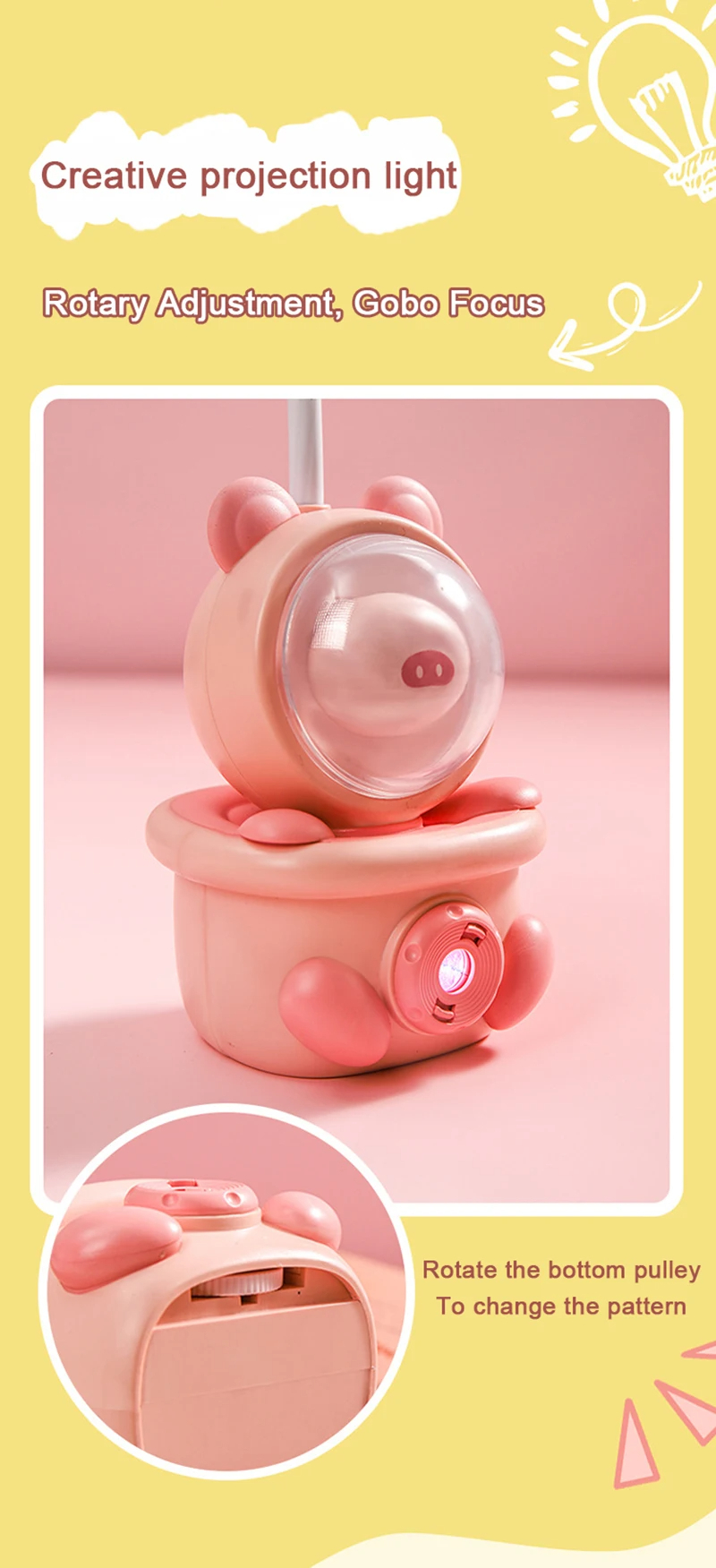 - Lampshade Material: Plastic Switch mode: Button type Style: Nordic Voltage: ≤36V Power supply method: built-in lithium battery Rated power: 4W Near function: Projection Product accessories: USB power cord
