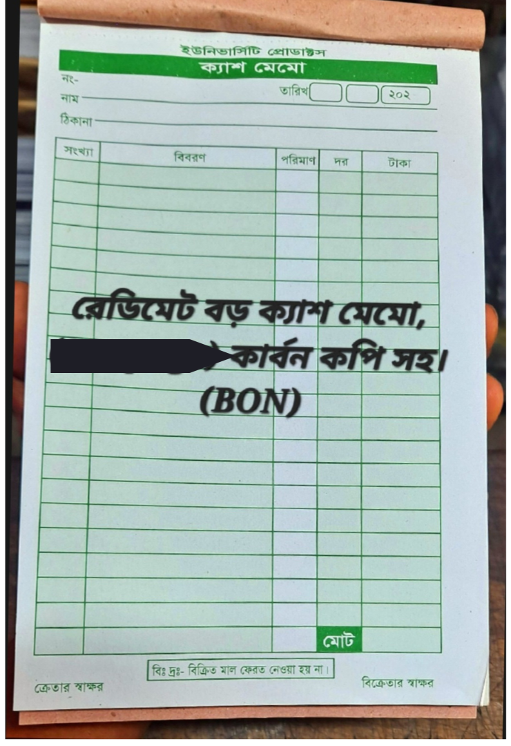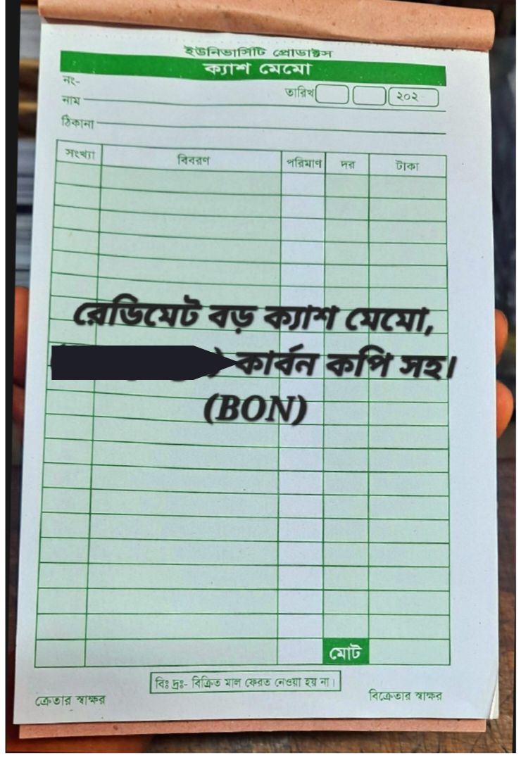 Our Big Size Cash Memo Pads are perfect for efficient and professional billing in any business setting. Each pad contains 100 pages—main copies and duplicate copies—for accurate record-keeping. Sold in a convenient pack of 6, these memo pads are made with good quality paper that ensures smooth writing and clear carbonless duplicates. Designed for daily business use, they serve as reliable billing or receipt books for shops, offices, and other commercial purposes. Proudly manufactured in our own factory in Bangladesh (BD), these pads are crafted with care to support your business documentation needs. Ideal for retailers, wholesalers, and service providers looking for dependable and organized transaction tracking tools.Customer Questions and answers :