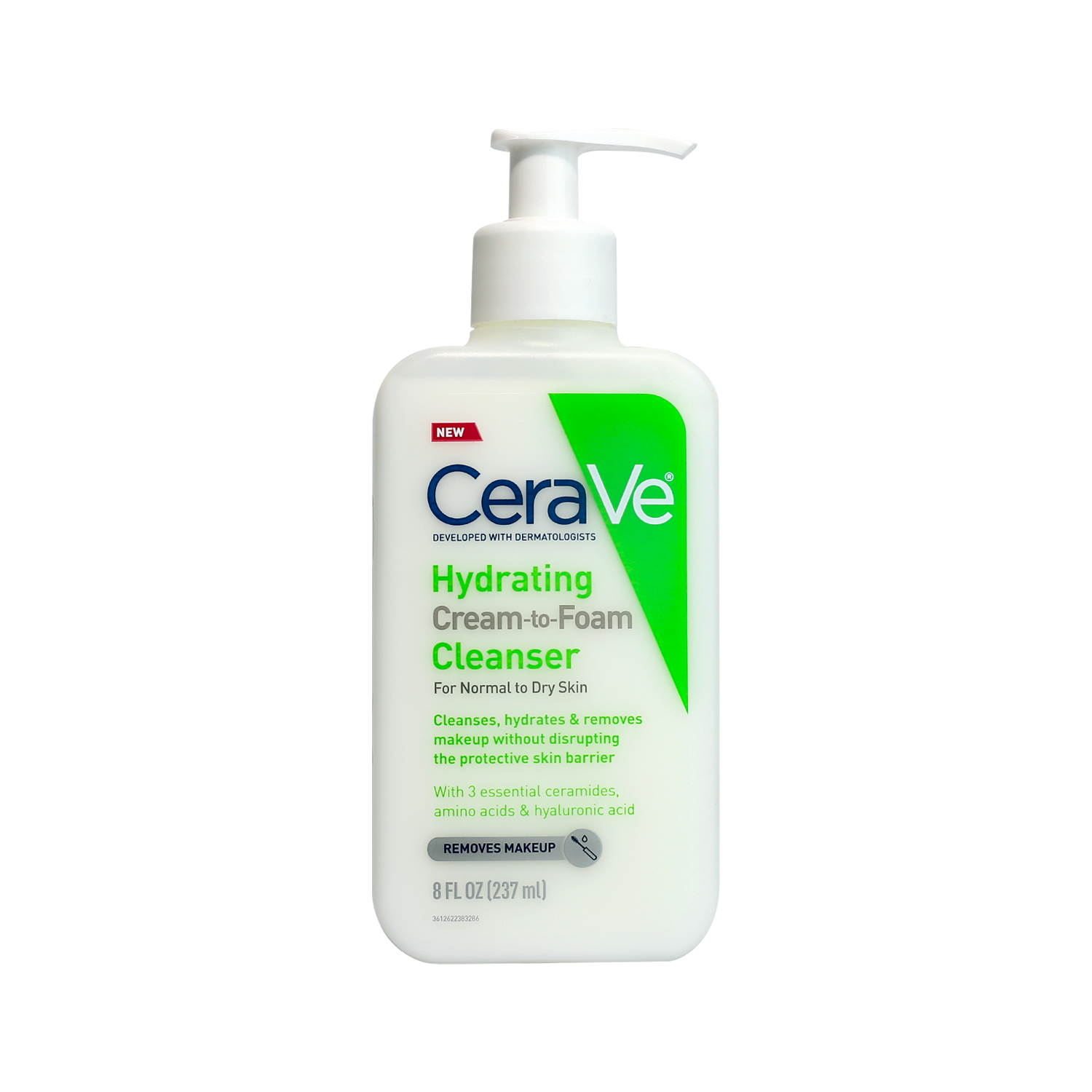 Developed with dermatologists, CeraVe Hydrating Cream-to-Foam Cleanser begins as a cream before transforming to a soft foam when you begin to lather it on the skin with water, and effectively removes dirt and makeup without stripping the skin’s natural moisture or leaving it feeling tight and dry. This gentle, fragrance-free formula features three essential ceramides, amino acids and hyaluronic acid, which work together to help maintain the skin barrier and lock in moisture.