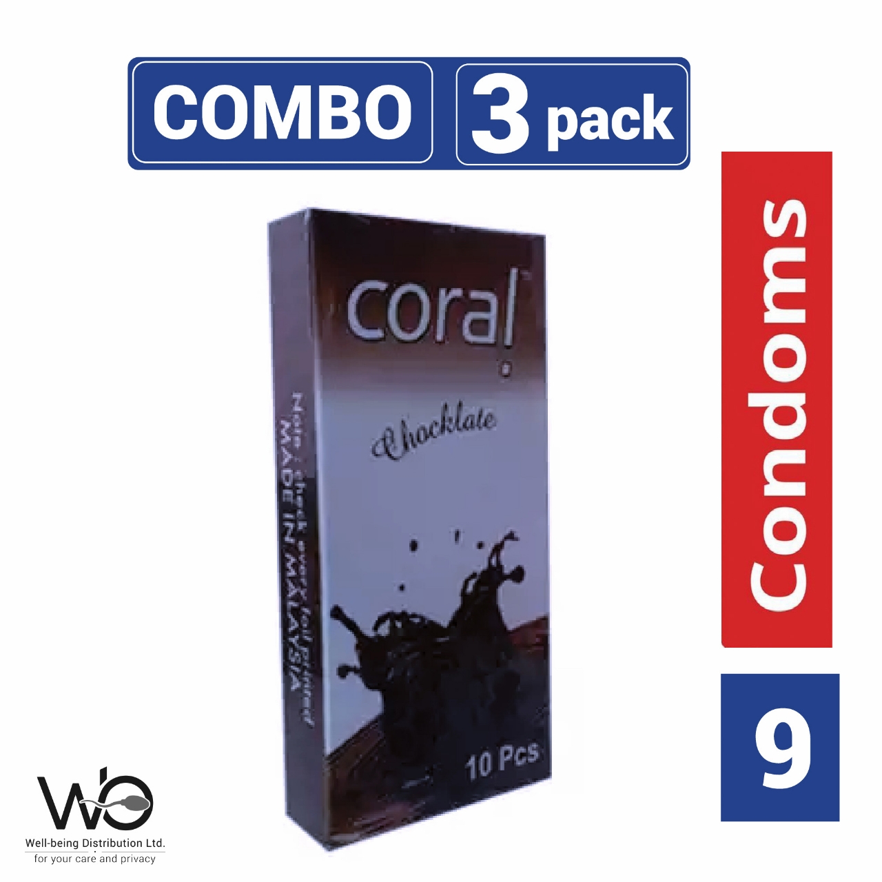 Product: Condom Brand: Coral Type: Chocolate Flavour Quantity: 3 pack Length: 180mm Width: 53mm +/- 2mm Country of Origin: Malaysia