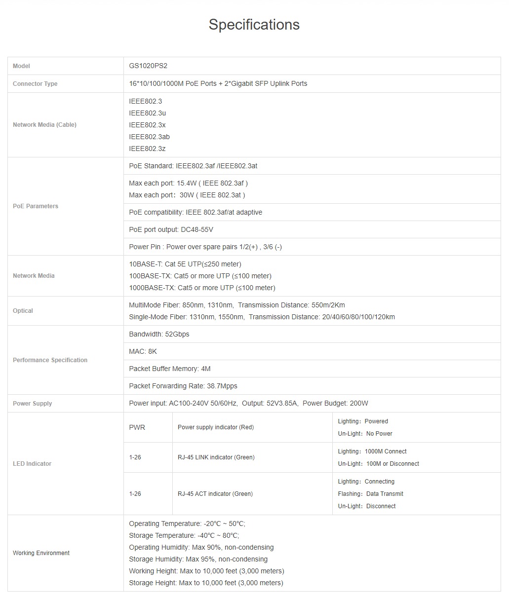 - 16xGbE PoE+Port+2xSFP/GbE Combo Port