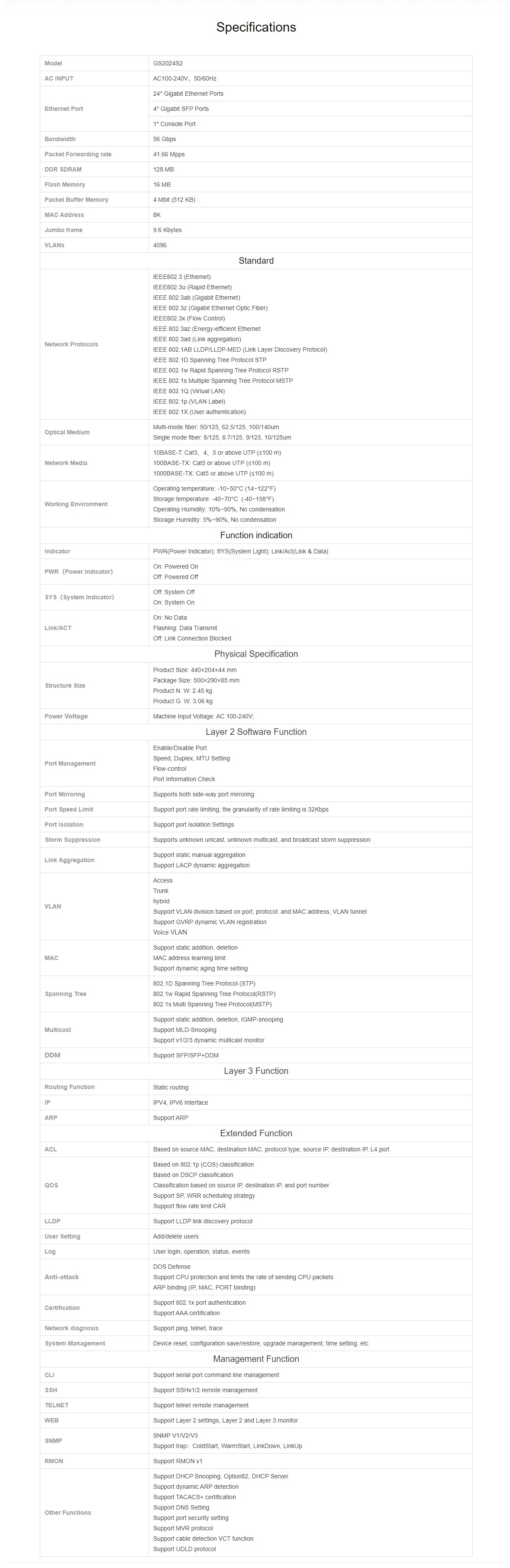 - 24× Gigabit Ethernet Ports + 4× Gigabit SFP Slots +1× Console Port