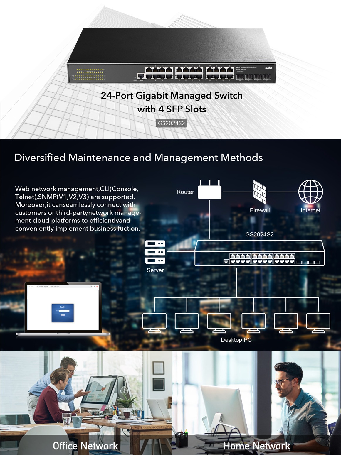 - Support WEB, TELNET, CLI, SSH, SNMP, RMON management