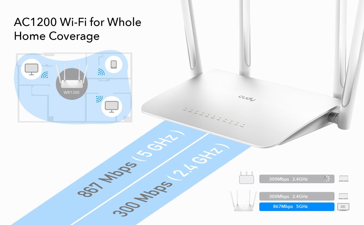 2.4GHz provides extremely long range, 5GHz reaches 867Mbps, ideal for gaming and 4K streaming.Simple tasks like web browsing can be handled by the 2.4GHz band, while bandwidth intensive tasks like online gaming or HD video streaming can be processed by the 5GHz band at the same time.