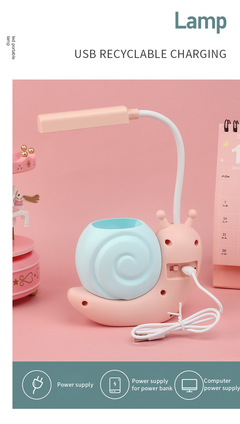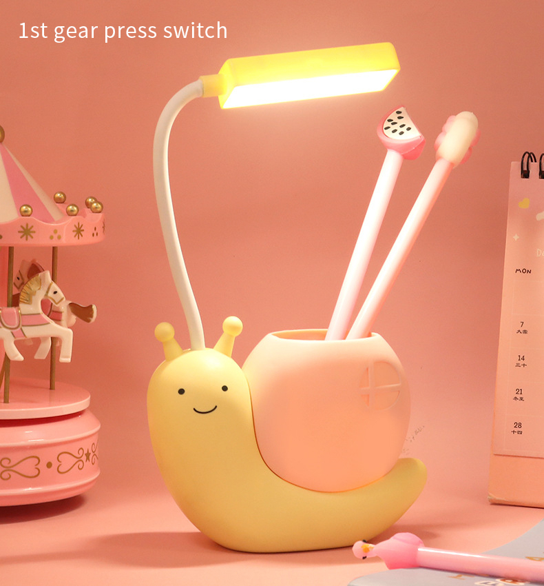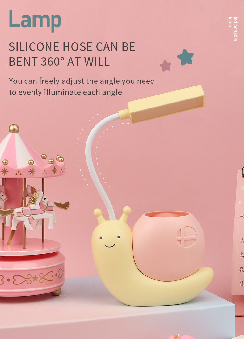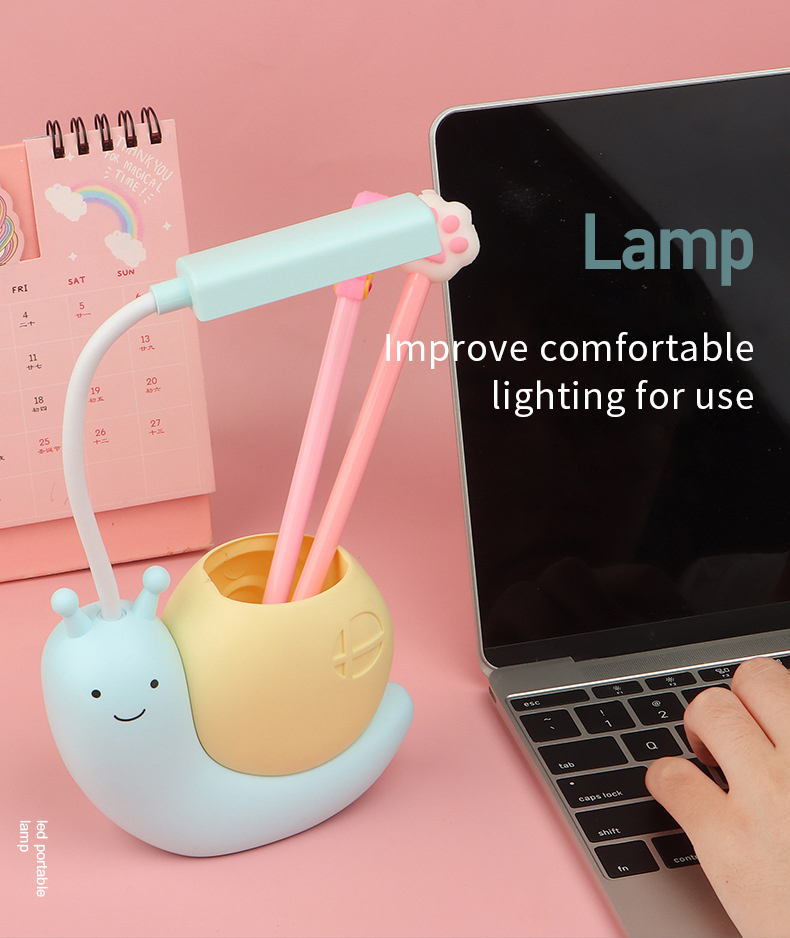 This snail lamp is designed according to the desk lamp in the study. It has a lovely shape and a position for holding pens, you can put your pen in it. And it can emit warm and soft light to accompany you to study, play and sleep.