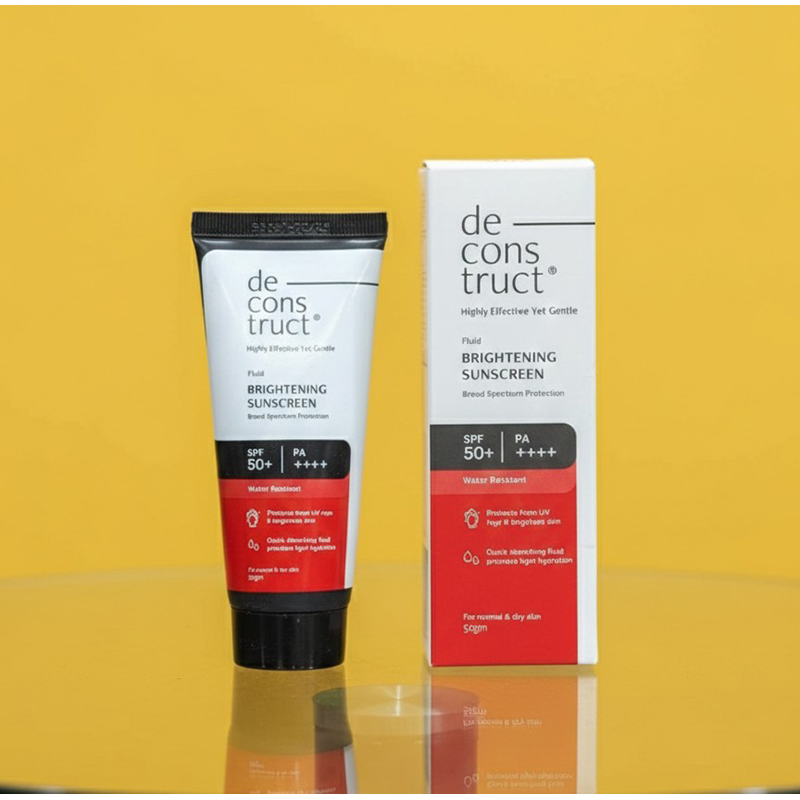 Deconstruct Fluid Brightening Sunscreen with SPF 50+ and PA ++++ is a silicone free water resistant broad spectrum formula that has a lightweight texture and absorbs quickly into the skin providing a brightening effect. This water resistant sunscreen for dry & normal skin contains powerful sun filters such as Butyl Methoxydibenzoylmethane, Benzophenone-3 & Ethyl hexyl salicylate that protects skin from harmful UV radiations and prevents the damage caused by both UVA and UVB rays. It also contains powerful ingredients such as Niacinamide that helps in brightening the skin.