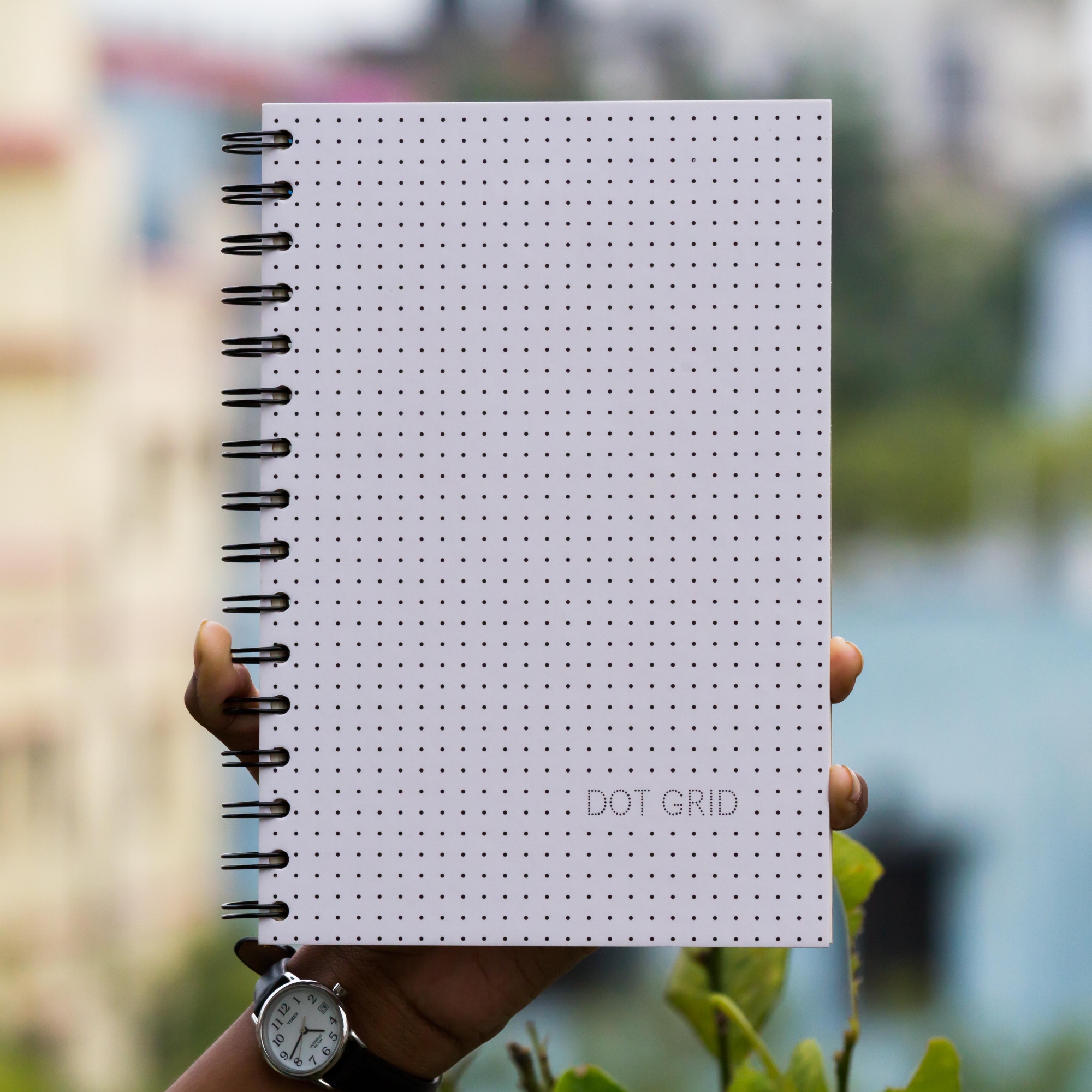 Designer Series White Dot Print Spiral Dotted Grid Notebook Describe of notebook 1. Sevendays Notes made for you. 2. Cover Design: "Design It". 3. Cover: 2-350 gsm pasting imported original Kraft virgin board rugged finished & flash cutting. 4. Innards: Cream white 80 gsm Dot-Graph fine paper. 5. Bound: "Double-O" ring wire binding. 6. Size: W- 5.4 in x H- 8.1 in. 7. Page: 80 leaves, 160 pages. *Especially: Dot-Grid paper uses dots at intersections instead of gridlines.