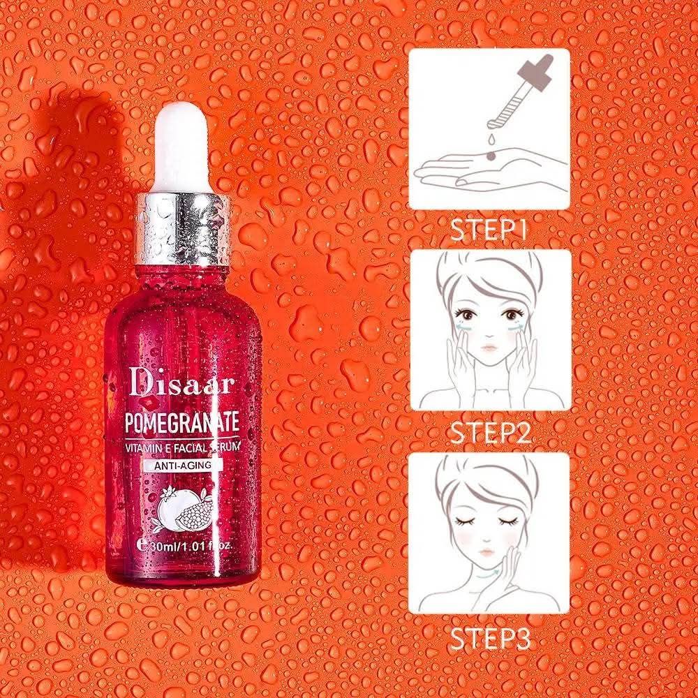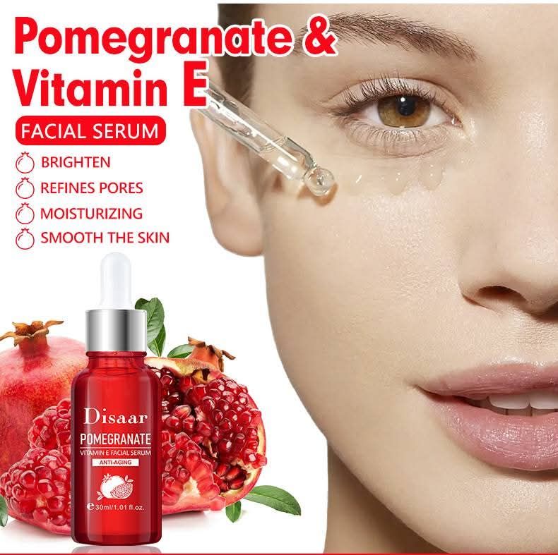 Disaar Pomegranate Vitamin E Facial Serum is a nourishing and revitalizing skincare solution designed to improve skin texture, enhance radiance, and provide deep hydration. Enriched with natural pomegranate extract and Vitamin E, this serum helps to fight signs of aging, fade dark spots, and restore a youthful glow. Pomegranate is rich in antioxidants, which protect the skin from environmental stress and premature aging, while Vitamin E helps to soften the skin, reduce fine lines, and improve elasticity. The lightweight formula absorbs quickly into the skin without leaving a greasy residue, making it suitable for daily use.This serum is ideal for all skin types, especially dull, dry, or tired-looking skin. With regular use, it promotes a smoother, firmer, and more luminous complexion.