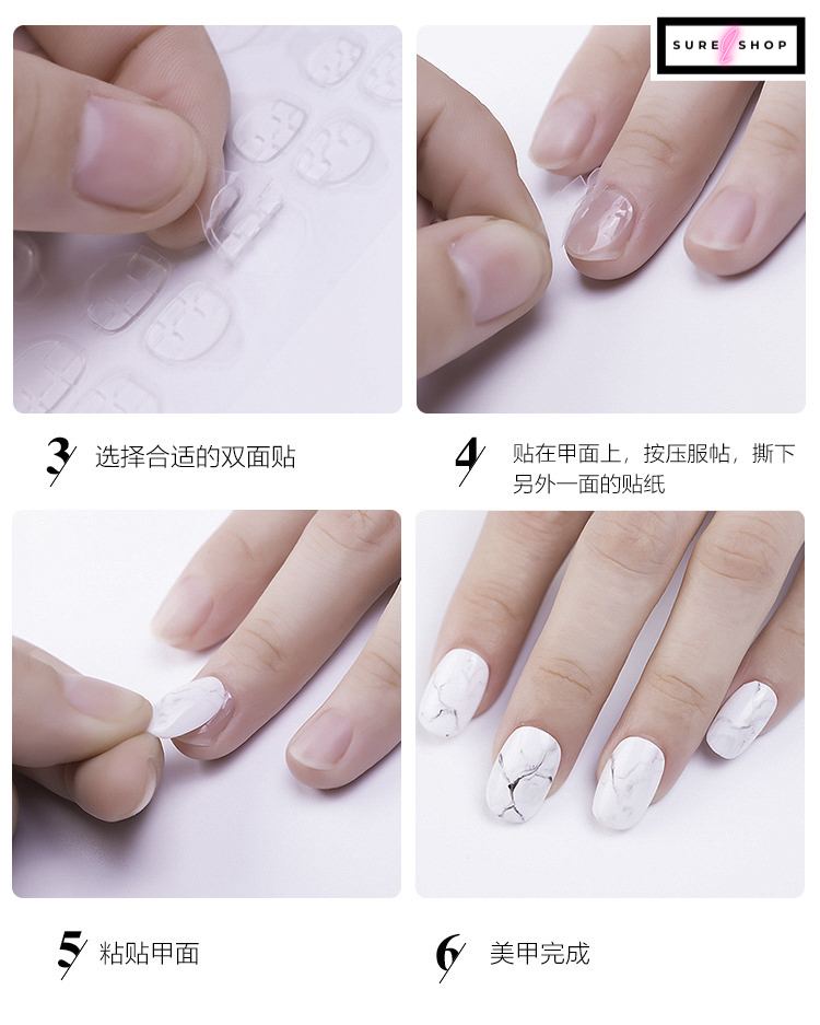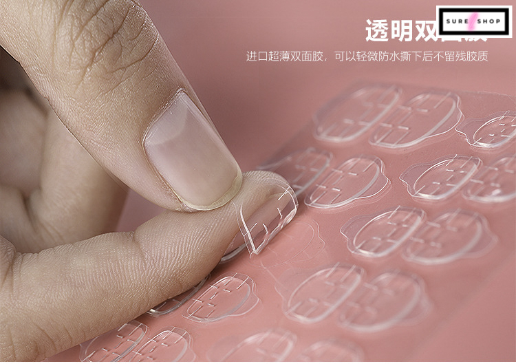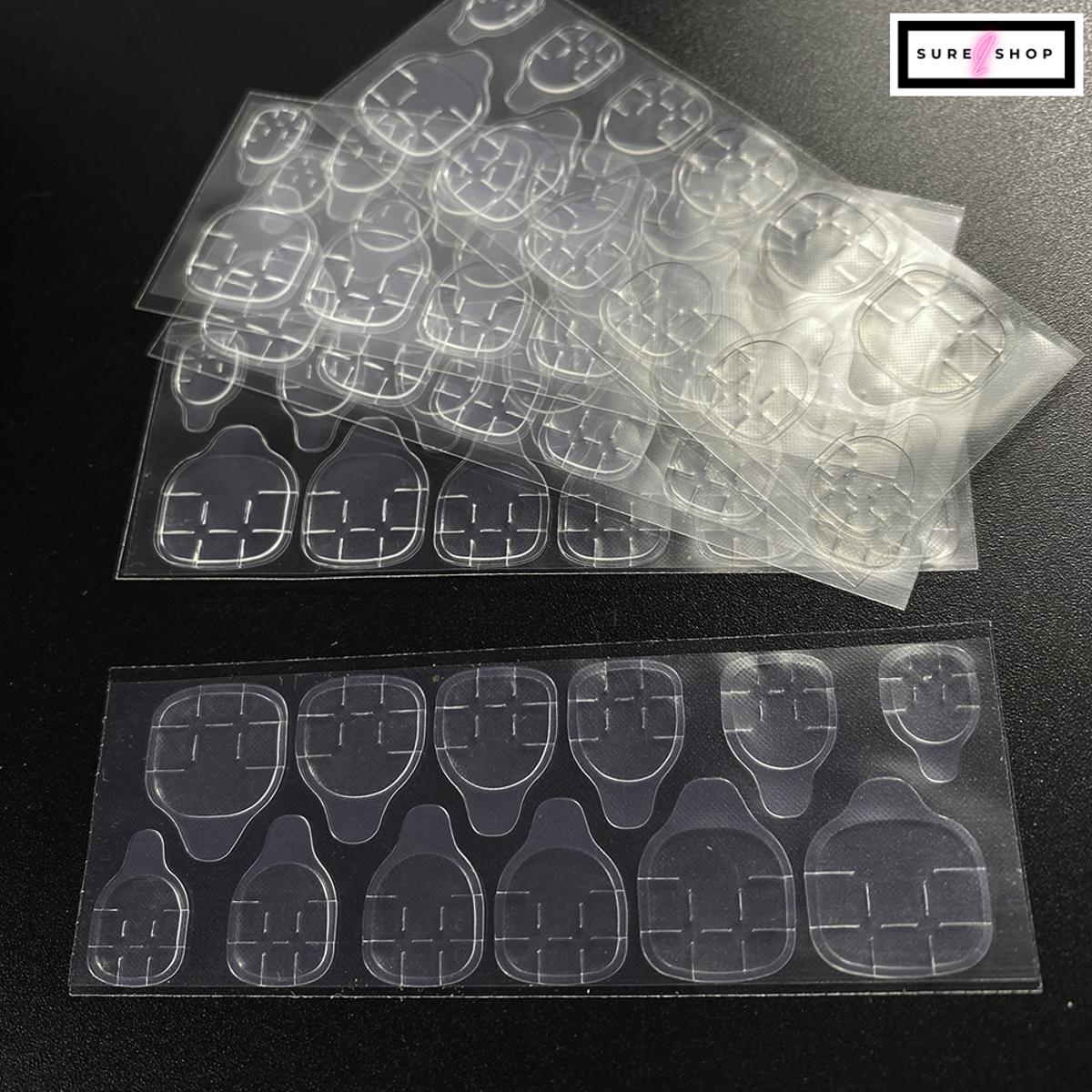- Sheets 12pcs Double Sided False Nail Art Adhesive Tape Glue Sticker DIYFeature:Quantity : 3 Sheets 36 pcs TotalMaterial: Adhesive Tape Material: Adhesive Tape Size app :8.5x7cm (Conversion: 1cm=0.39inch) How to use: Select a sticker which fits the false nail tip. Take the sticker out and place it to the false nail tip. Gently press the sticker to ensure no bubble or gap between the sticker and the false nail tip. Remove the protection sheet from the sticker. Place the false nail tip to your finger Press the false nail tip toward your finger with pressure for 5 seconds. To remove, soap your finger(s) in warm water, gently move the false nail tip away from your finger.