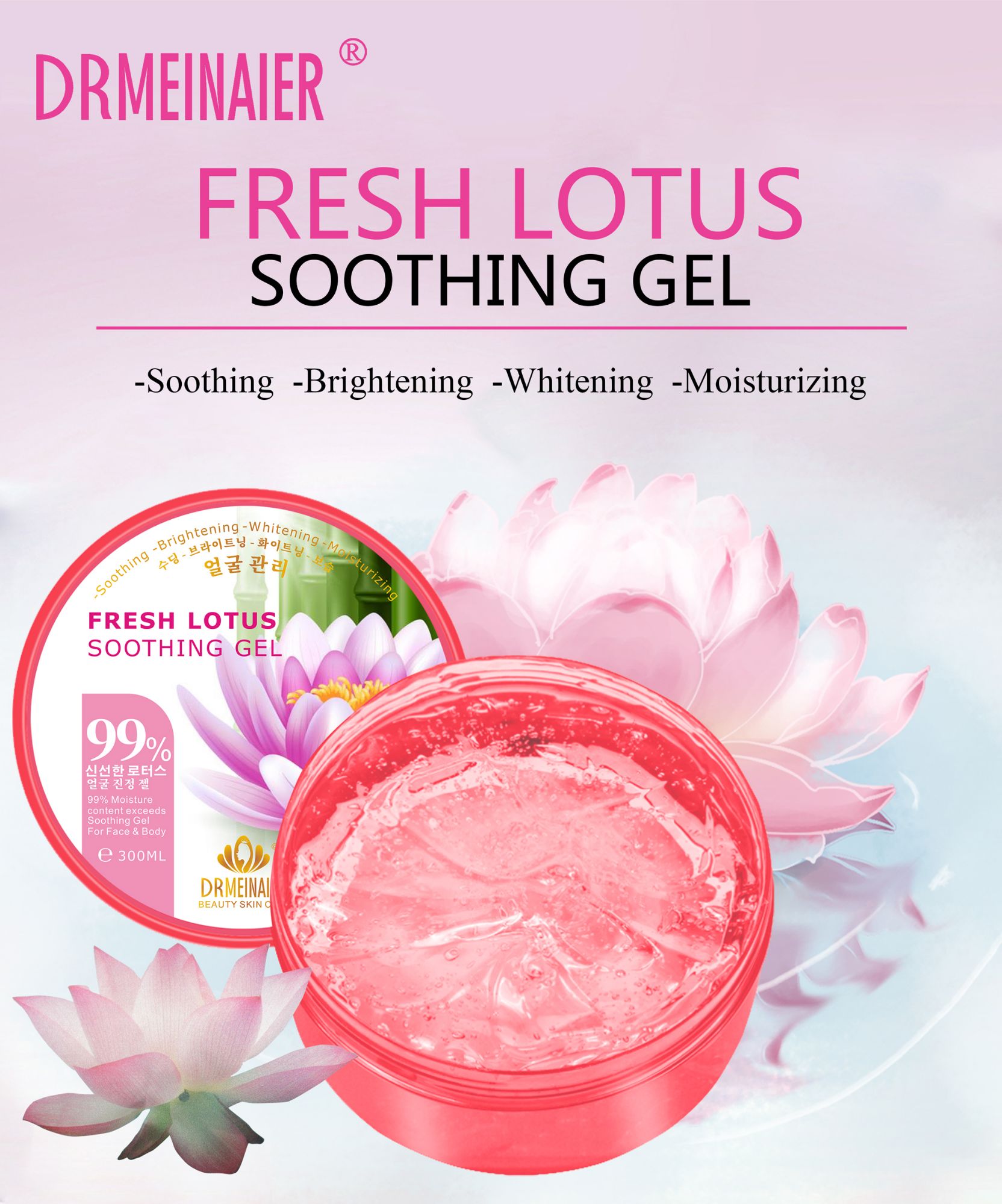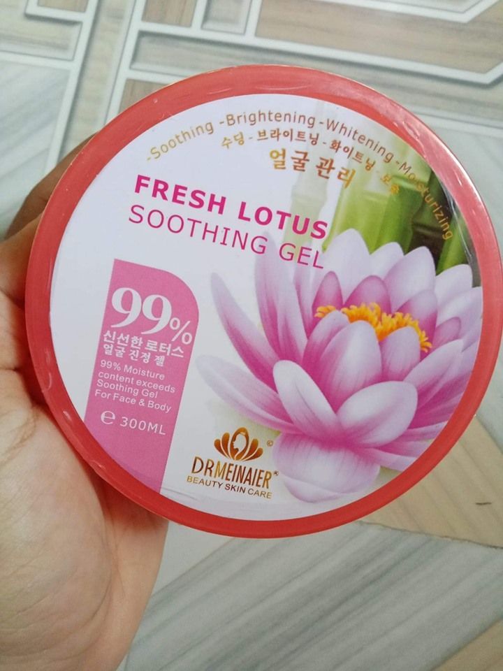 Dr. Meinaier fresh lotus soothing gel a good product for skin care 99% Moisture content exceeds soothing gel for face & body. Fresh Lotus Soothing Gel is made up of clear, glass-like beads that contain Lotus Flower Extract from Jeju Island. This multipurpose gel protects against harmful environmental aggressors, soothes tired skin and can be used daily or after sun exposure. It is a nutritious vegetable good for health, has been selected as one of the world’s to 100 food. Ampoule of vitamins in the effective in making a smooth skin. With extract essence, soothing gel 99% easily gets absorbed into the skin, and moisturizes and gives nutrition to the skin. It also helps maintain moisture for a long time. Drmeinaier Fresh Lotus Soothing Gel - 300g a nutritious vegetable good for health, has been selected as one of the world's to 100 food. Ampoule of vitamins in the effective in making a smooth skin. With extract essence, soothing gel 99% easily gets absorb. How to use apply on the last stage of the basic skincare also recommenced as a nutrition pack once-twice a week for dry skin.