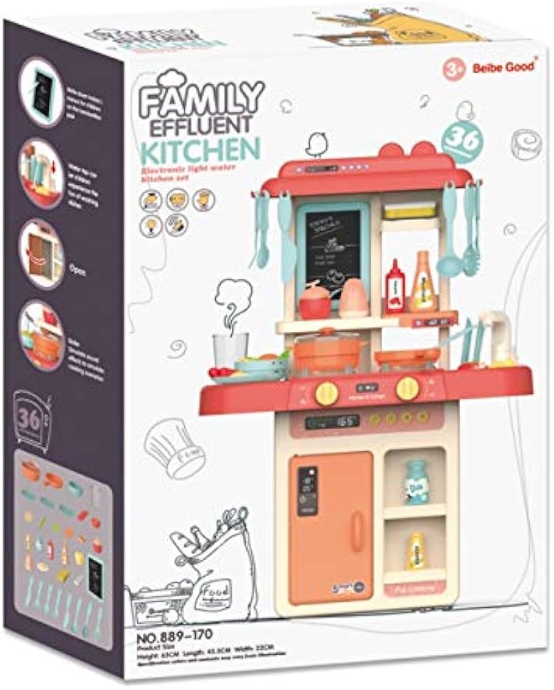 Complete with a 36-piece set of various of simulated vegetables, fruits, pots, plates, forks, spatula, etc., that children can play freely