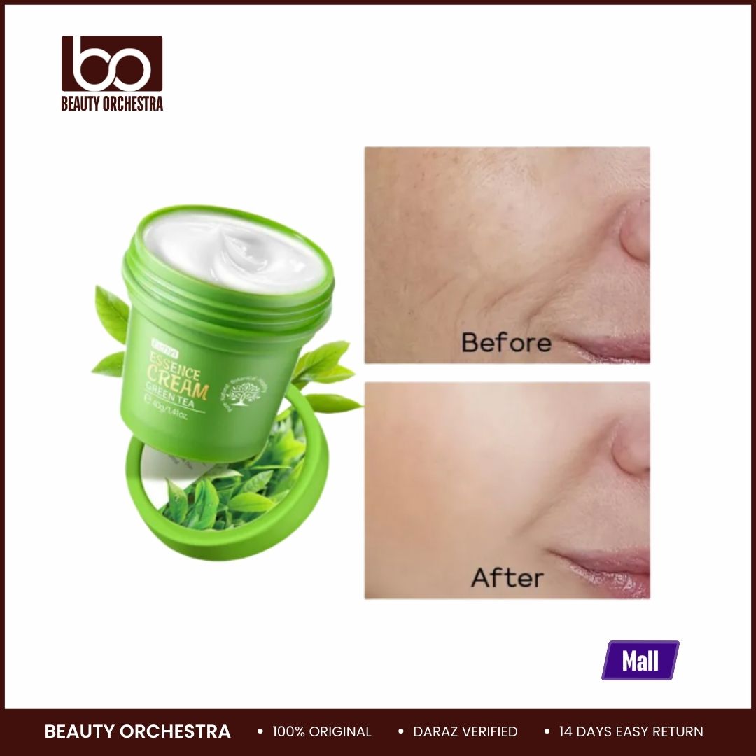 Fenyi Green Tea Essence Cream is a 40g facial moisturizer formulated to nourish and rejuvenate the skin. It features a blend of natural extracts, including Korean Camellia Sinensis (Green Tea) Leaf Extract, Melaleuca Alternifolia (Tea Tree) Leaf Oil, Centella Asiatica Extract, and Chrysanthellum Indicum Extract. These ingredients work together to hydrate the skin, balance oil production, and alleviate acne-related issues. The Green Tea Extract also helps inhibit tyrosinase activity, reducing melanin formation and brightening the complexion.
