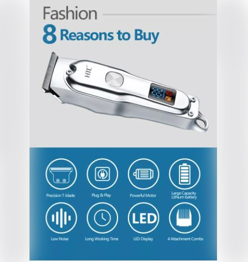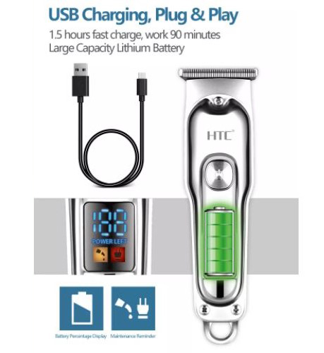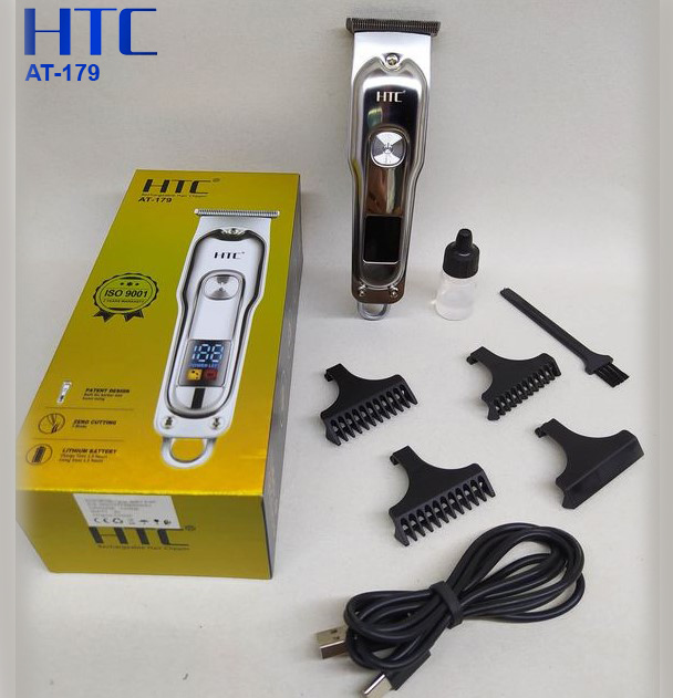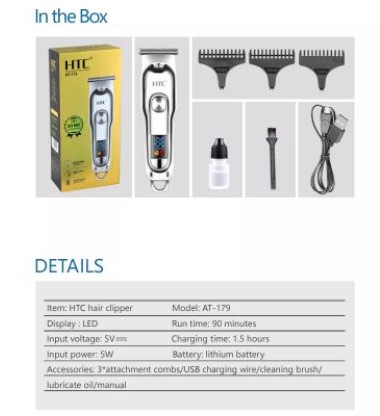 Brand: HTC Model: AT-179 Warranty: One month service warranty Charging time: 1.5 hours USB fast charging Maximum runtime: 90 minutes Color: Silver, Gold Item type: Beard Trimmer and Hair Clipper Blade material: Stainless Steel Body material: Metal Power source: Rechargeable Battery Battery type: Large capacity lithium battery Length settings: combs 1, 2, and 3 mm Accessories attachments 3 x guide combs 1 x USB charging wire 1 x cleaning brush 1 x lubricate oil 1 x manual Rated power: 5 W Rated voltage: 110-240 V Rated frequency: 50/60 Hz Country of origin: Taiwan