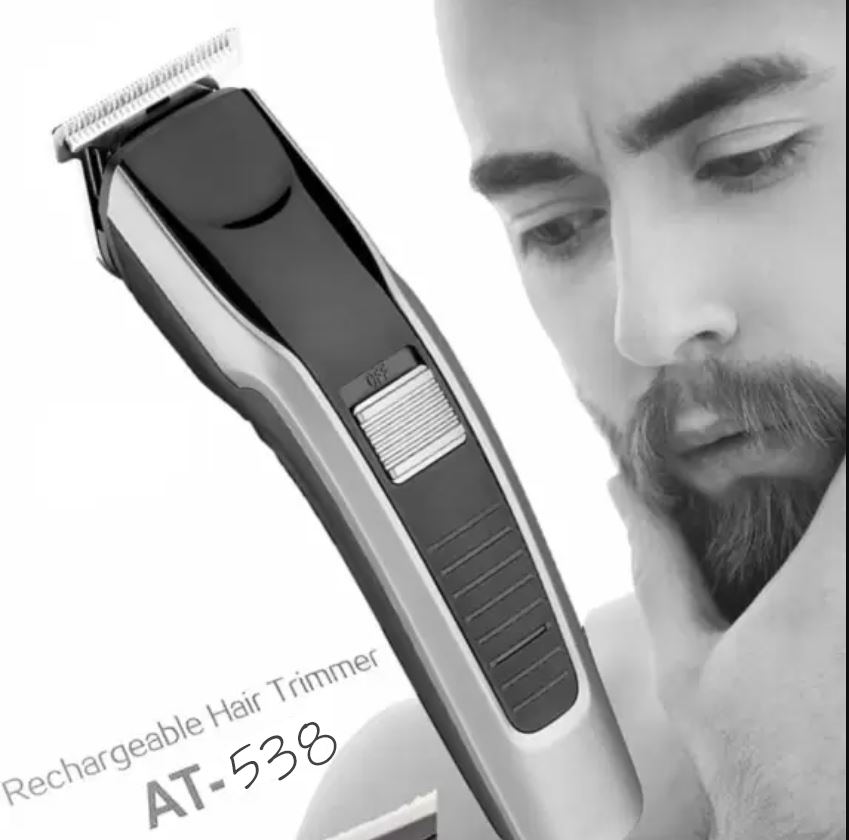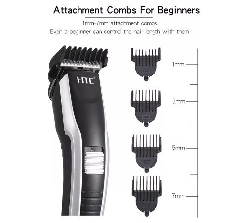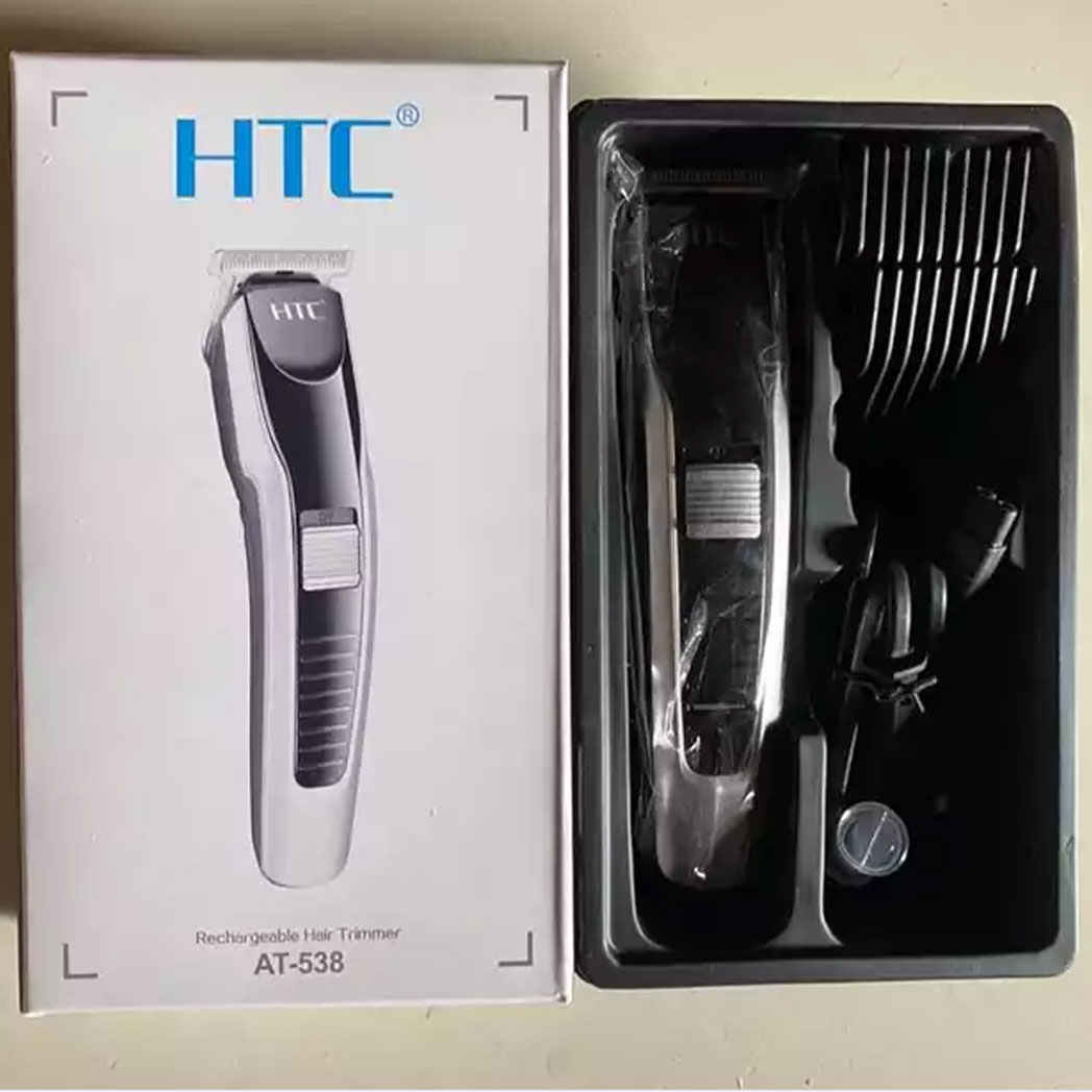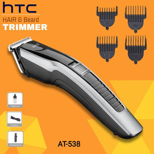 Product Details HTC AT 538 Rechargeable Hair and Beard Trimmer for Men Brand: HTC Product type: Trimmer Gender: Men and Women Model: AT-538 High-grade stainless steel blade Compact design and comfortable to use Ergonomic design for easier handling Effortless even trim Quick-release blades for easy cleaning 45 minutes of cordless use Skin-friendly blades for smooth skin 4-detachable 1mm, 3mm, 5mm, & 7mm comb Blade material:Stainless steel Charging indicator: Yes Rated voltage: 110-220 V Color: Black and Silver (As given picture).