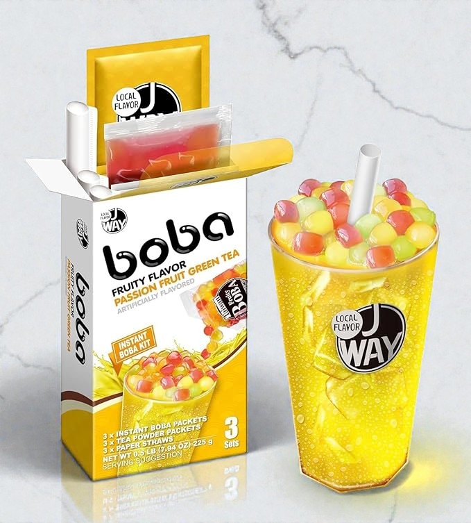 J WAY Instant Boba Passionfruit Green Tea is a tasty and refreshing drink you can make at home in minutes. The pack includes 3 servings, chewy boba pearls, and paper straws. It has a sweet and fruity passionfruit flavor mixed with light green tea. Easy to prepare and perfect for home, office, or anytime you want a quick and fresh drink.