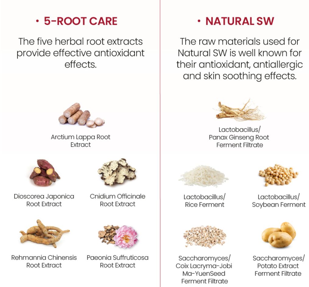 Infused with 5 types of herbal root extracts that provide antioxidant effect and Lactobacillus/Panax Ginseng Root Ferment Filtrate that soothes skin.