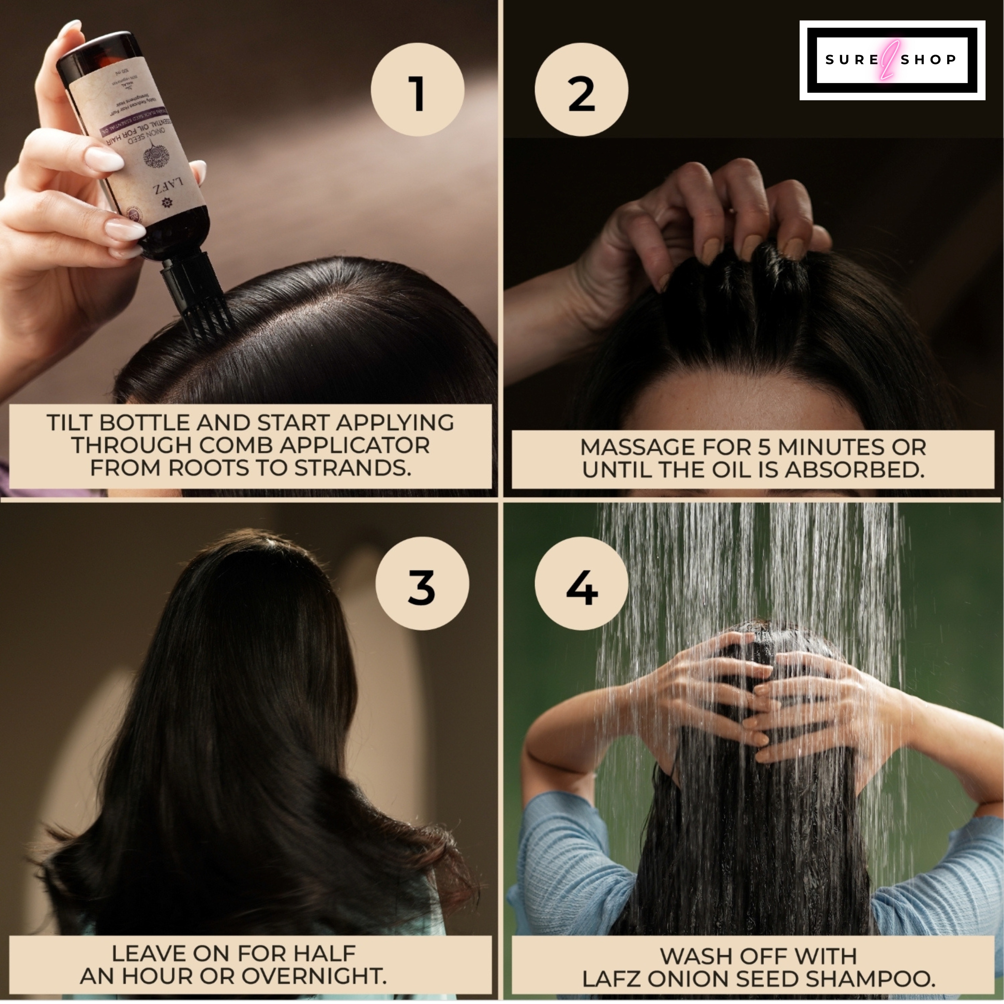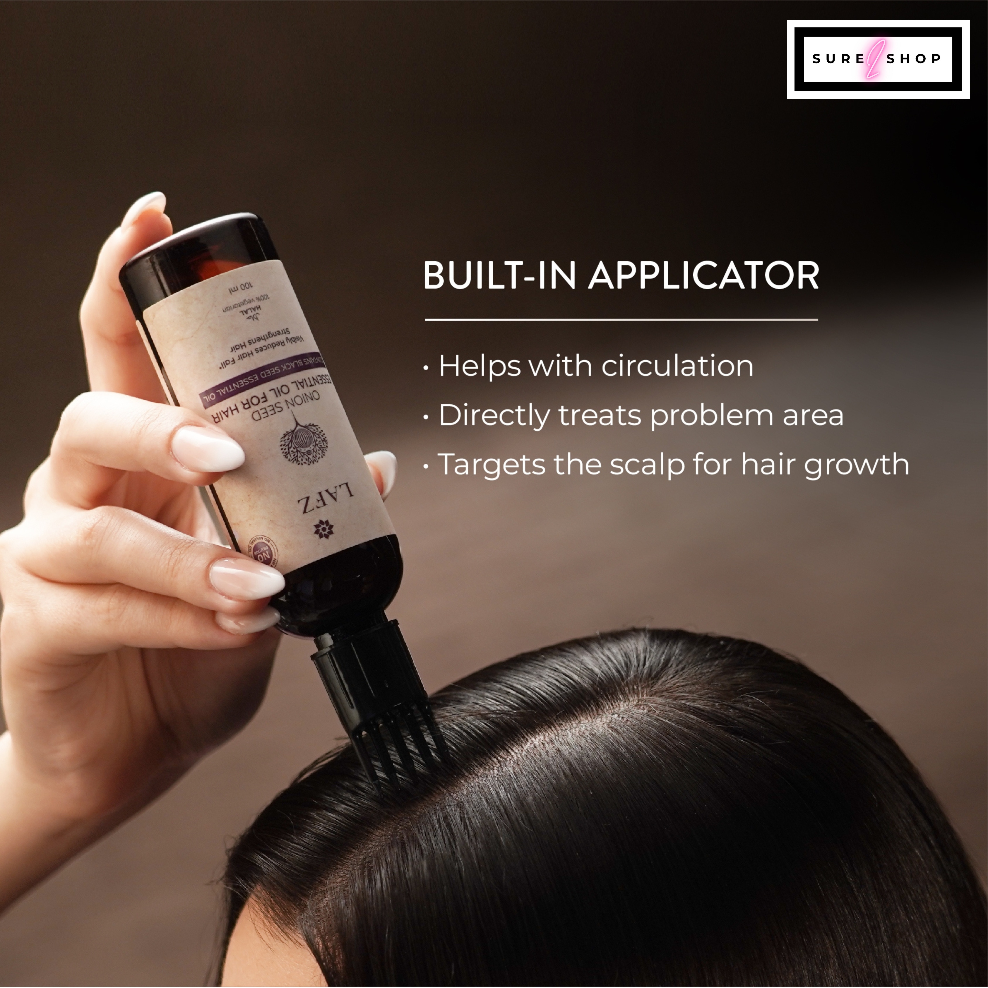 - Part your hair in two halves and apply the oil directly to the scalp using the comb applicator. The built-in applicator ensures that the oil reaches the roots directly.