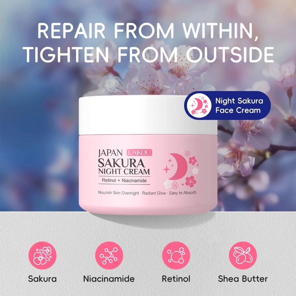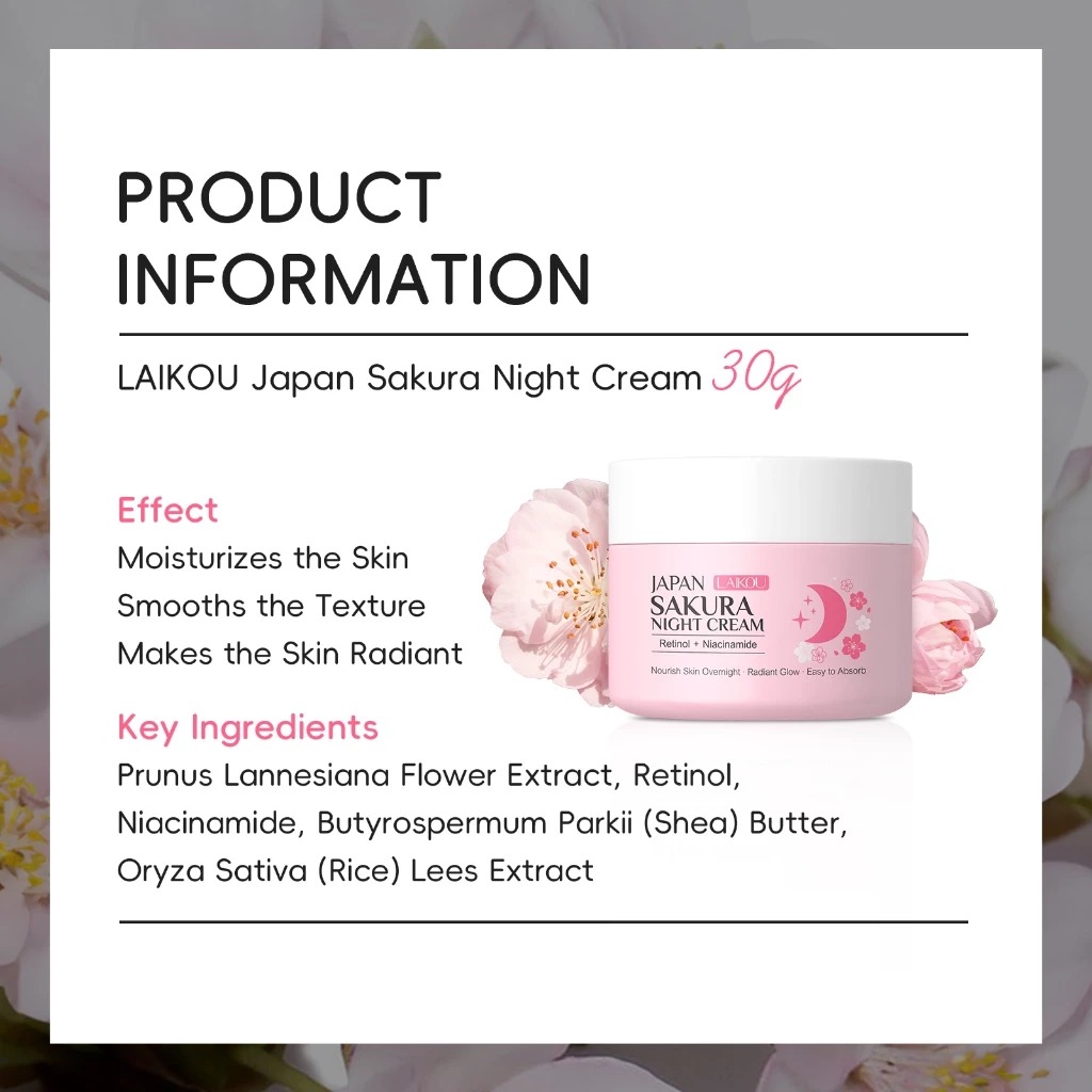 Description: LAIKOU Japan Sakura Essence Cream is rich in Sakura Active Extract and Nicotinamide, which can deeply moisturize the skin, replenish nutrition and enhance the skin. It solves the skin problems like skin dullness, fine lines and skin aging. From inside to outside, it restores skin elasticity and rejuvenates the skin.
