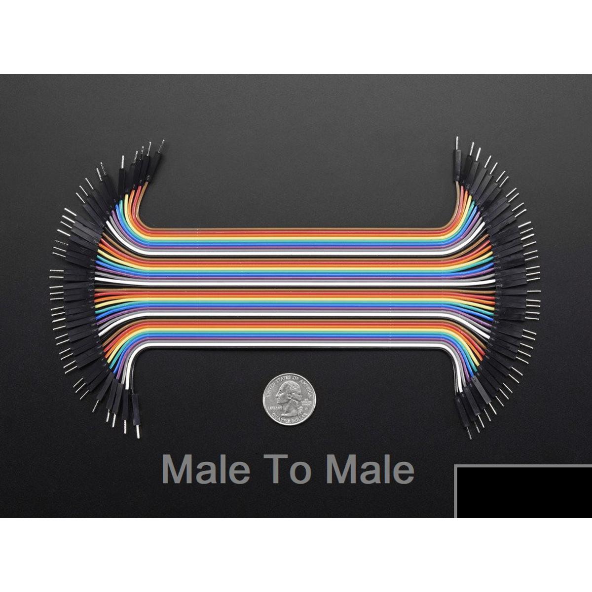 These premium jumper wires are 7″ long. They have 0.1″ male header on both end. They can be installed next to each other on standard pitch 0.1″ header. 40 jumper wires in 4 set of each of ten rainbow color. You can always pull the ribbon wires off to make individual jumpers, or keep them together to make neatly organized wire harnesses.This is a set of 40 connected male-male dupont jumper wires. The wires can all be used together or easily peeled apart individually or in sections. They fit snug next to each other on a breadboard, when placed with the silver side out because the side with the silver showing through the black connector is standard breadboard spacing (2.54mm) compared to 2.25mm on the other side.