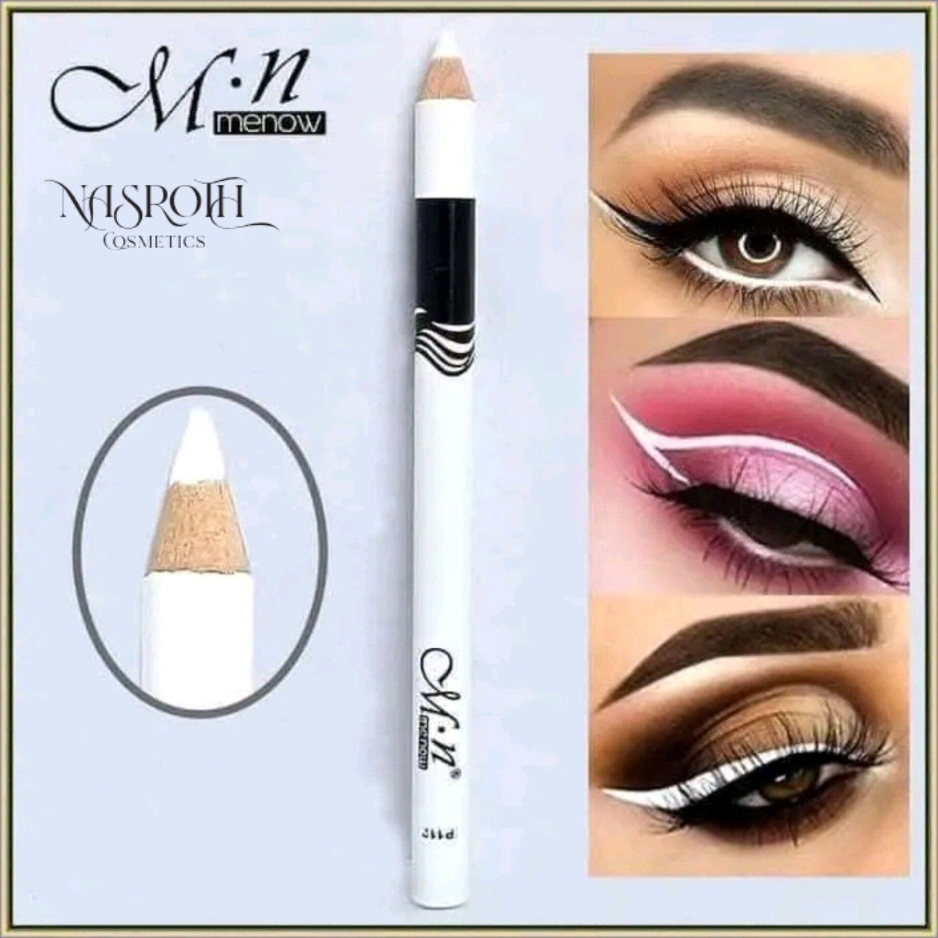 The MN Menow White Kajal Eyeliner is a must-have beauty essential for anyone who loves enhancing their eye makeup. This creamy, soft, and smooth white pencil instantly brightens your eyes, making them look bigger, more awake, and attractive. Perfect for both everyday wear and special occasions, it adds a touch of elegance and freshness to any makeup look.