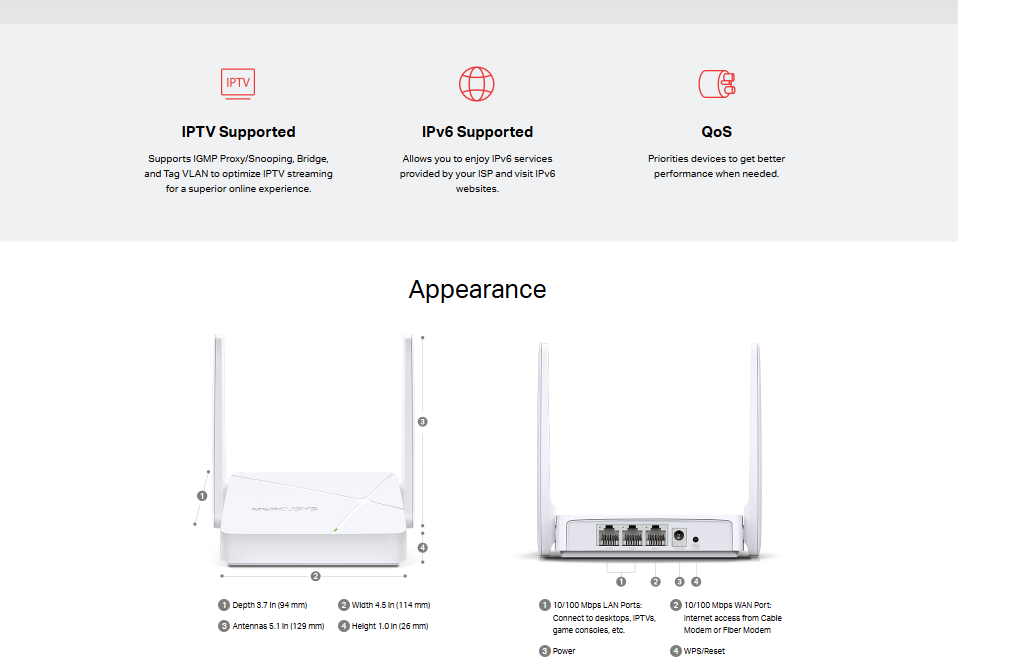 1× 10/100 Mbps WAN Port, 2× 10/100 Mbps LAN Ports