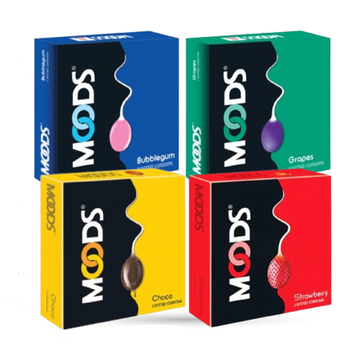 Moods Condom For Men Women Mix Flavor Combo Pack 3pcs x4 | Dotted Chocolate, Strawberry, Grapes, Bubblegum Flavor Condom | Wedding, Honeymoon, Valentine Couple Combo Pack | India