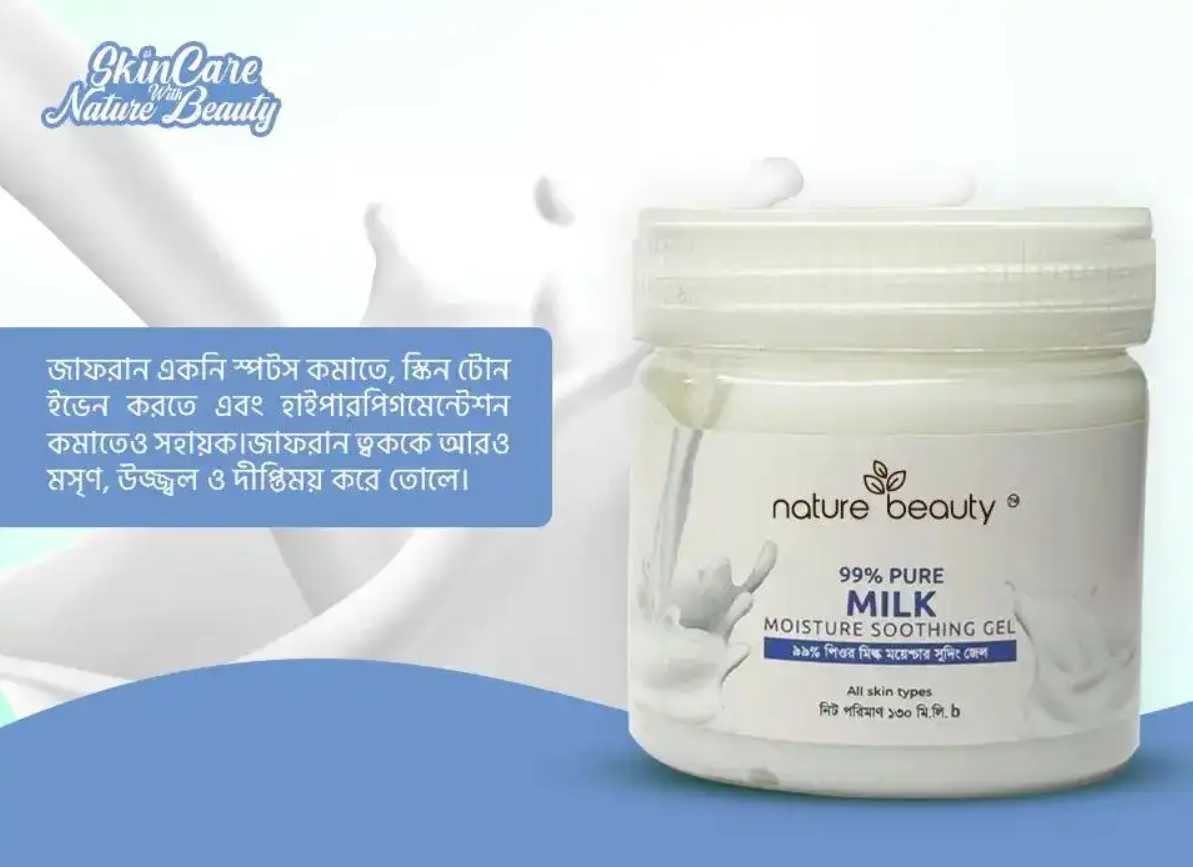 - Nature Beauty 99% Pure Milk Moisture Gel- formulated with pure milk extract providing long-lasting moisture, making it perfect for all skin types. Consist of vitamins and proteins, it helps to improve skin texture and elasticity, promoting a glowing and youthful appearance.