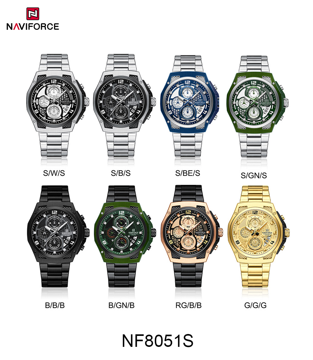 The NF8051T watch features a unique brushed metal case and personalized rivet design, showcasing an avant-garde, unruly fashion style. This watch exhibits a tough, sharp new attitude, attracting consumers who pursue individuality and quality.