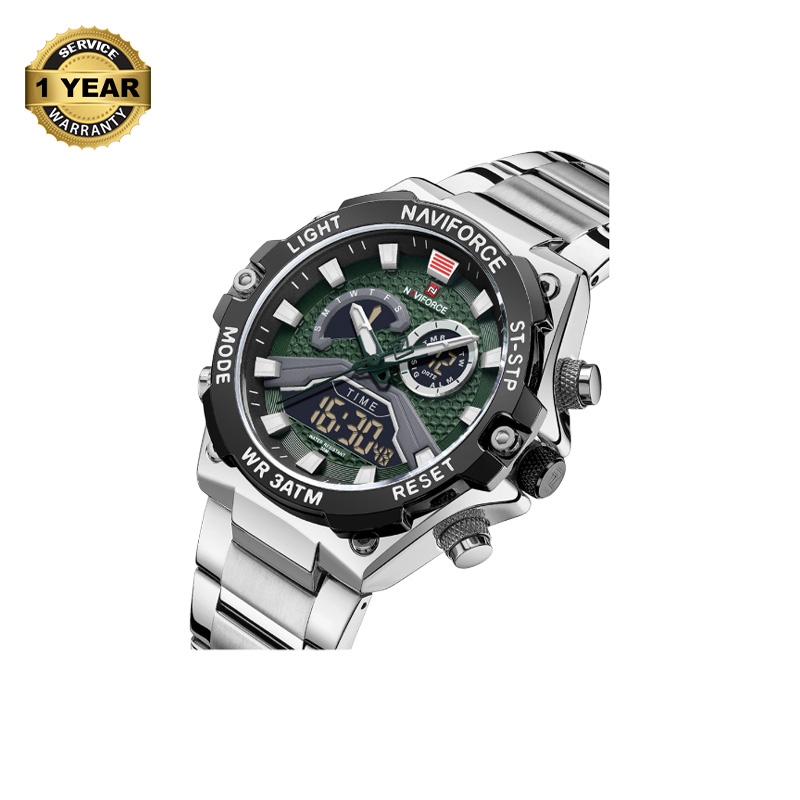 NAVIFORCE NF9207 Golden Stainless Steel Dual Time Watch For Men - Green & Silver