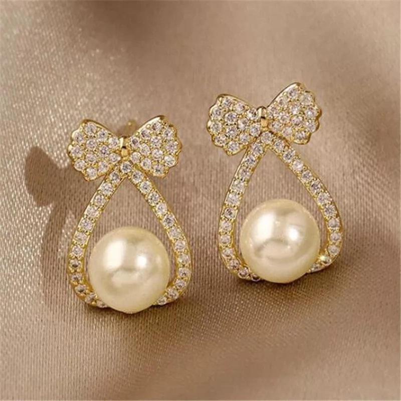 New Elegant and Exquisite Zircon Bow Pearl Earrings For Woman 2021 Korean Fashion Jewelry Party Girl Temperament Earrings