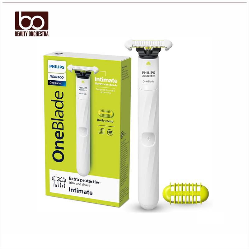 The OneBlade Intimate is a grooming tool specifically designed for trimming and shaving sensitive areas—including pubic, underarm and body hair—with extra skin protection. It features the SkinProtect blade, a rounded-edge dual-sided cutter, along with an attachable body comb to control hair length. The unit is rated as 100 % waterproof (IPX7), allowing use in the shower or bath. It’s designed for both men and women who seek safe, hygienic grooming for intimate zones.