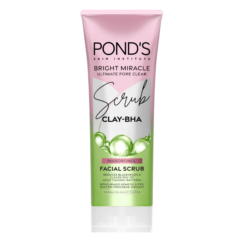 - This facial scrub brightens and cleanses skin, reducing blackheads and acne problems. Unleash the power of clay and BHA with Pond's Bright Miracle Ultimate Pore Clear Clay-BHA Facial Scrub. Designed to cleanse deeply and target clogged pores, this facial scrub combines the purifying properties of clay with the exfoliating action of BHA. It effectively removes excess oil, dead skin cells, and impurities, leaving your skin feeling refreshed, smooth, and visibly clearer. With regular use, it helps reduce the appearance of pores and blackheads, giving you a brighter, more radiant complexion. Suitable for oily and combination skin types, this scrub is your go-to solution for balanced, healthy-looking skin.