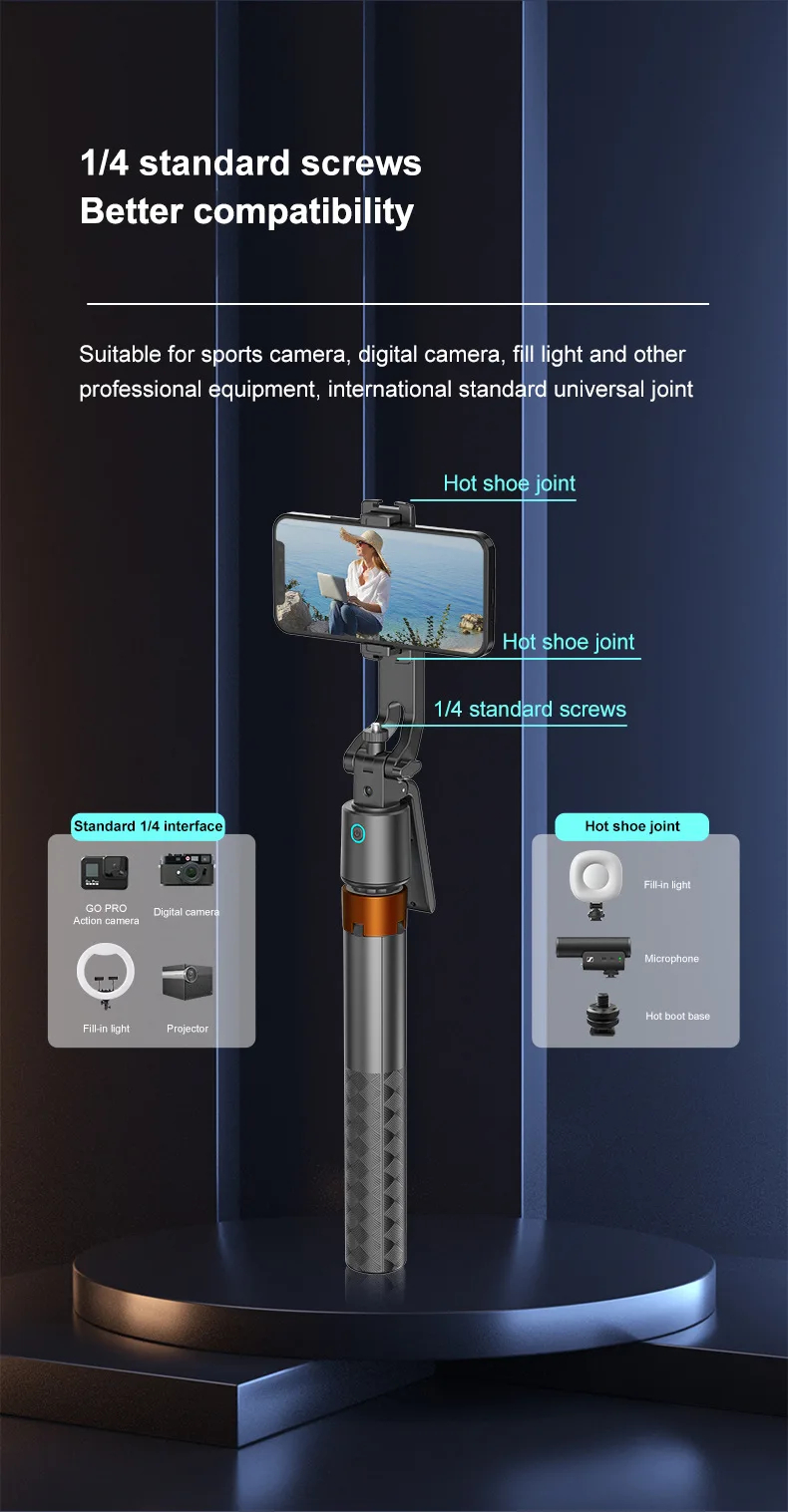 The built-in fill light ensures clear and bright video or photos even in low-light conditions, ideal for vlogging, live streaming, selfies, and video calls. With Bluetooth remote control and 360° rotation, you can capture smooth, professional-looking shots effortlessly. Its lightweight and portable design makes it perfect for travel, outdoor shoots, and daily use.