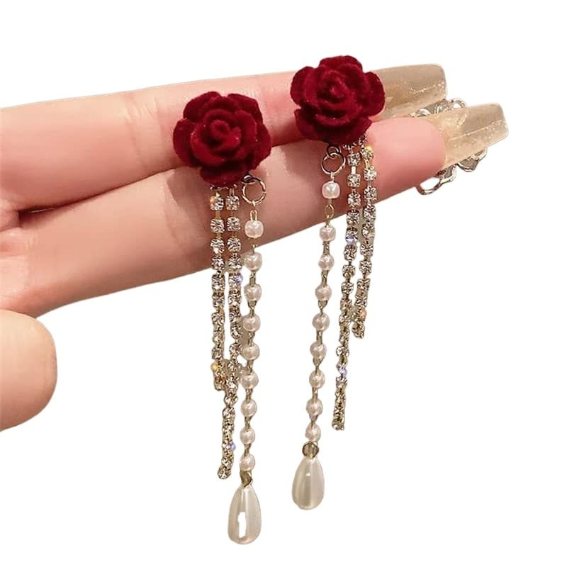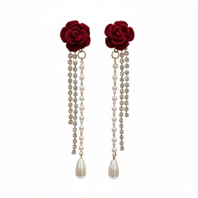 Red Rose Flower Long Tassel Earrings for Women Wine Red Flocking Bow Pearl Tassel Earrings Elegant Luxury Jewelry Gifts