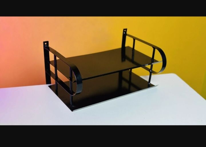 A sleek, wall-mounted storage solution designed to organize and protect your WiFi router, cables, and accessories. Made from durable black metal, it combines functionality with modern aesthetics, perfect for minimizing clutter while ensuring ventilation and easy access