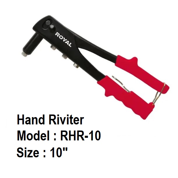 Introducing the ROYAL 10" Heavy Duty Steel Hand Riveter (Model: RHR-10), a reliable tool for your DIY and outdoor projects. With a hardened steel body and PVC smooth handles, this riveter is designed for durability and comfort during use. It's suitable for aluminum rivets of various sizes, from 2.4mm to 4.8mm, and comes with a supplied nozzle wrench for added convenience. The 10-inch length and 18oz weight make it easy to handle, while the blister card packaging ensures its protection. Whether you're working on hand tool parts or accessories, this ROYAL riveter is a must-have for your toolbox.