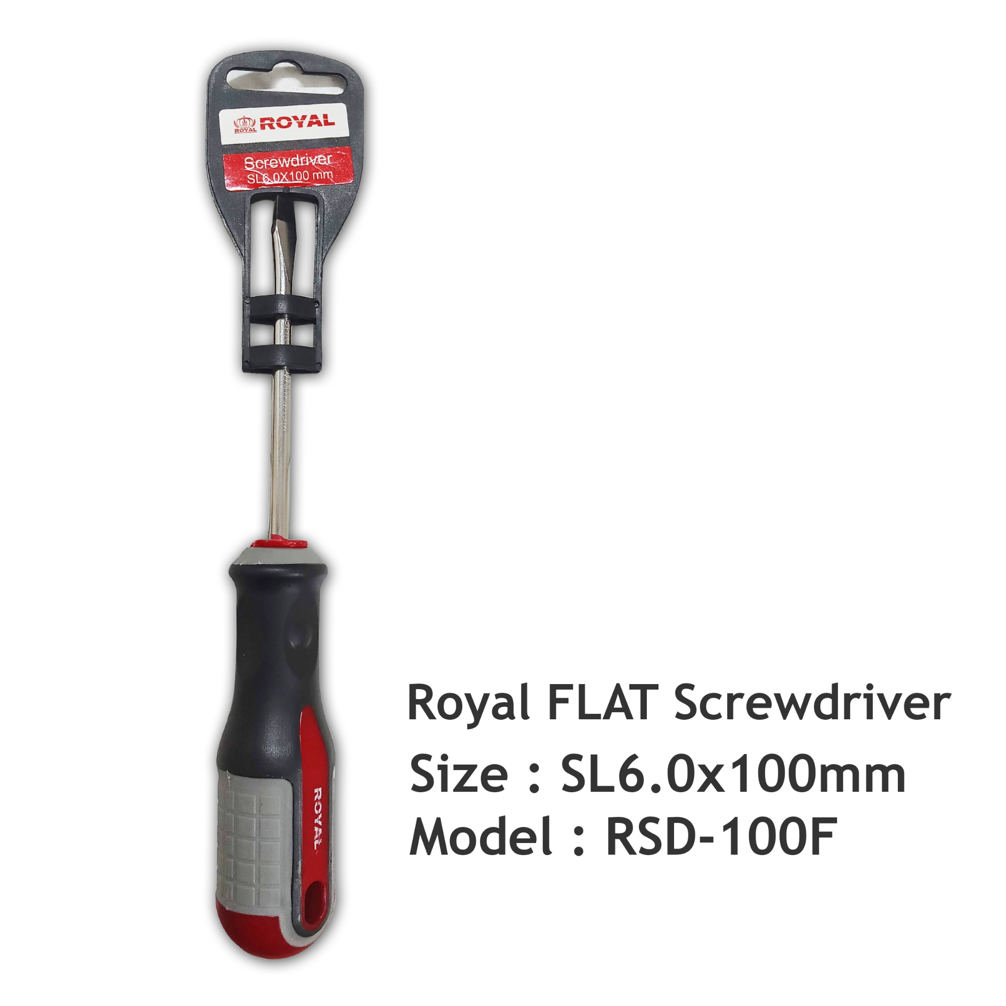 Introducing the ROYAL SL6.0x100mm Slotted FLAT Screwdriver With Magnetic Tip Model RSD-100F, a reliable hand tool for DIY enthusiasts and professionals. Crafted from durable Chrome Vanadium, this screwdriver features a comfortable two-component grip and a sleek black finish. The magnetic tip ensures secure handling of screws, while the slotted SL6.0x100mm size makes it versatile for various projects. Packaged in an inner box with plastic hangers, this screwdriver is convenient to store and access. Whether you're working on household repairs or intricate projects, the ROYAL screwdriver is a dependable companion.