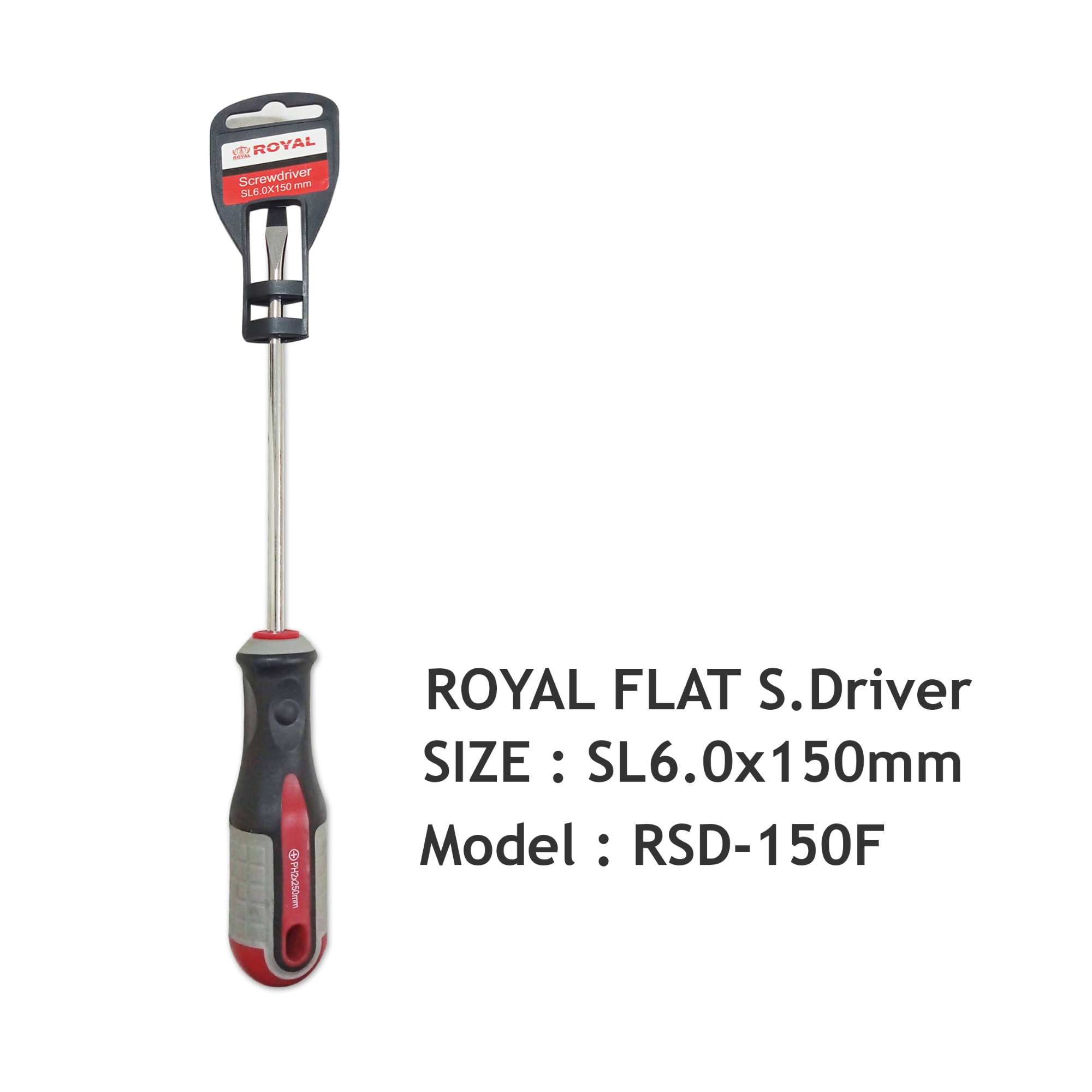 Introducing the ROYAL SL6.0x200mm Slotted FLAT Screwdriver with Magnetic Tip Model RSD-150F, a reliable hand tool for DIY enthusiasts and professionals. This screwdriver features a 6.0x200mm slotted flat tip with a magnetic end, ensuring secure and precise screw handling. The ROYAL brand guarantees durability and efficiency, making it an essential addition to any toolbox. Whether you're working on household repairs or professional projects, this screwdriver provides the accuracy and reliability you need. The tone of voice is informative.