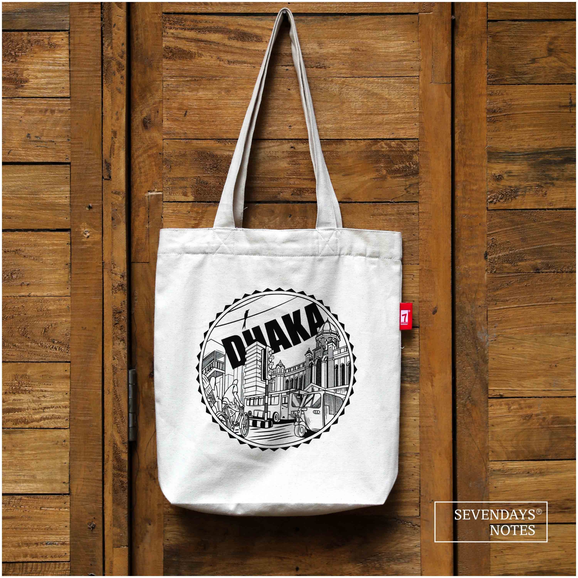 Sevendays Dhaka Line (Black Print Round) White Canvas Tote Bag with Inside Pocket