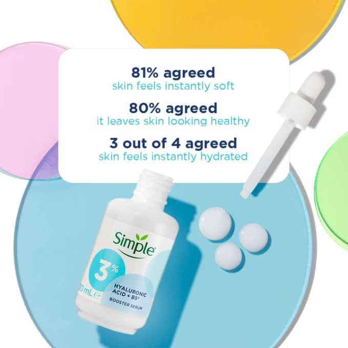 Hyaluronic acid is our hydrating, power-plumping miracle for youthful-looking skin. Our new Booster Serums are powered by high-performance ingredients to supercharge your skin care routine for instant, visible results. This hydrating serum is a real multitasker; along with locking moisture into dry skin and improving skin texture, it also relieves irritation, making it the perfect partner to calm dry or sensitive skin. Packed with 3% active ingredients (95% of which are naturally derived), it contains 0.5% active hyaluronic acid, 0.5% active PENTAVITIN™ and 2.5% active provitamin B5 – the dream team for soft, plump skin. Our kind to skin promise? Like all Simple products, our Booster Serum is dermatologically tested, non-comedogenic, contains no harsh chemicals that can upset your skin and is free from alcohol, mineral oils, artificial colours and perfume. This Simple product is also PETA approved vegan. Shake, drop, dab – application is that simple. After using a cleanser, apply our non-sticky, non-greasy formula alone or mix a few drops into your favourite moisturiser to give dry skin a super-quick hydration boost. Oh, and it’s fab under makeup too. Try cocktailing it with our 10% vitamin C + E + F Serum Booster in the morning (remember your SPF) and 10% Niacinamide (B3) & B5 in the evening – it goes well with both, but make sure you use them at different times (niacinamide and vitamin C get on better when they're used separately). The best part? Real people love it. 81% agreed their skin felt instantly soft, 80% said it looked healthy and 3 out of 4 agreed it felt instantly hydrated. The stats don’t lie, so try it yourself – we love to know what you think of our new products so leave us a review.